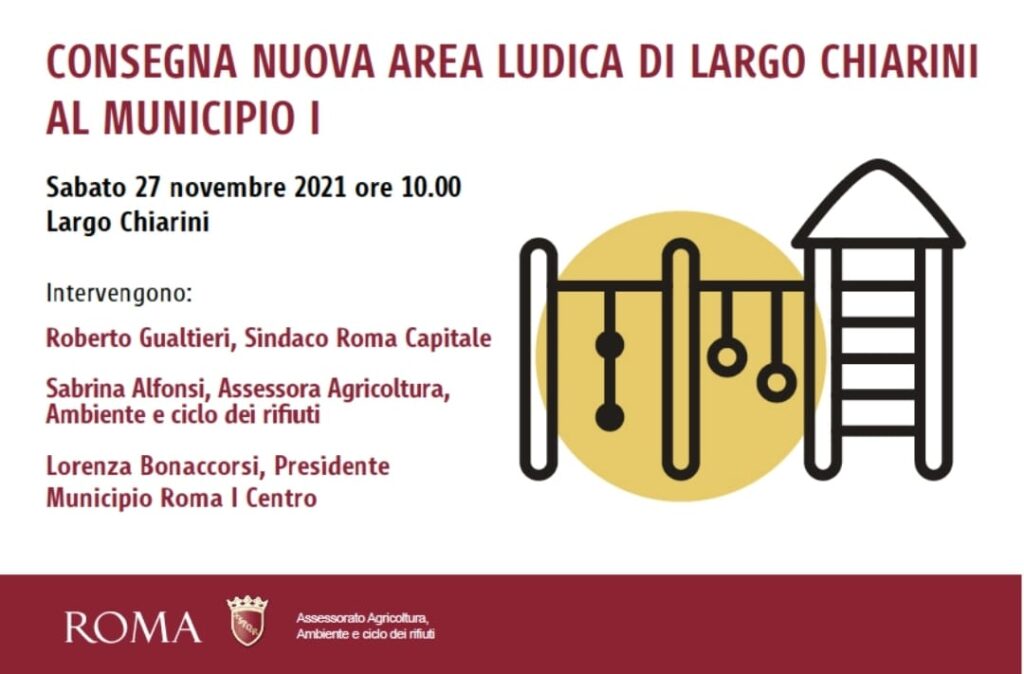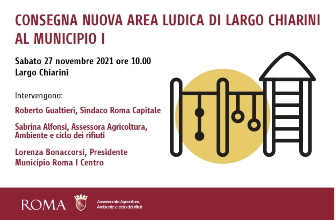 (AGENPARL) - Roma, 26 Novembre 2021 - (AGENPARL) – Roma, 26 nov 2021 – Il Sindaco di Roma Roberto Gualtieri e l’Assessora all’Agricoltura, Ambiente e Ciclo dei Rifiuti Sabrina Alfonsi consegnano al Municipio I l’area giochi di Largo Chiarini domani 27 novembre ore 10.