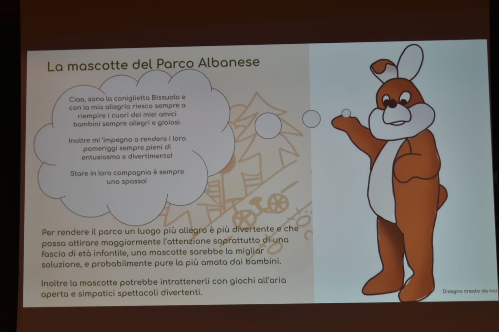 Non solo proposte, ma anche consigli pratici per finanziare questi interventi: ad esempio vendendo delle magliette con simpatici disegni che i ragazzi hanno già ideato, o con “Bissuola”, la coniglietta che potrebbe diventare la “mascotte”, e testimonial, del parco, anch’essa nata dall’estro creativo dei giovani studenti.