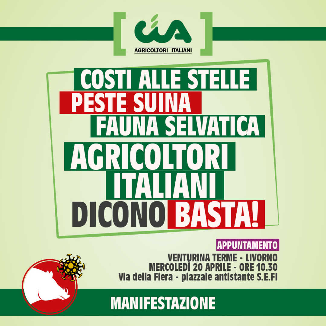Roma, 14 apr – Nuova e terza manifestazione di Cia-Agricoltori Italiani contro costi di produzione alle stelle, peste suina ed emergenza fauna selvatica. A mobilitarsi, scendendo in strada tra bandiere e trattori, questa volta sono gli imprenditori agricoli del Centro Italia che si sono dati appuntamento mercoledì 20 aprile, alle ore 10:30, a Venturina Terme, frazione del comune italiano di Campiglia Marittima, in provincia di Livorno.