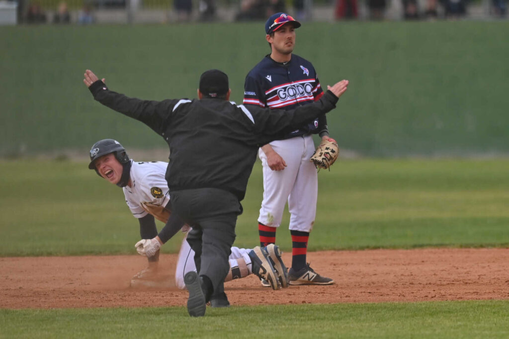 Foto: Federico Dentoni (Farma Crocetta) esulta dopo essere arrivato salvo in seconda base. Credit: El Tambor Mayor