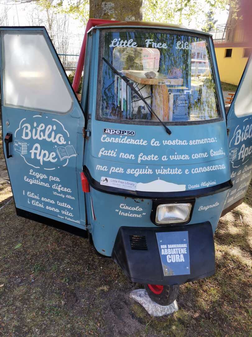 Ma cosa è una Little Free Library? Si tratta di una piccola libreria all’aperto, dove tutti possono prendere o lasciare dei libri affinché altri li possano leggere. Le prime Little Free Library, oggi presenti in tutto il mondo, sono nate negli Usa nel 2009: venivano posizionate nei parchi delle cassette di legno, come quelle utilizzate per gli uccelli, e al loro interno inseriti dei libri. A Berlino sono state ricavate nei tronchi degli alberi morti, a simulare una biblioteca naturale a impatto zero. Rick Brooks ha messo in rete tutte quelle esistenti in giro per il mondo. Peculiare e deliziosa la scelta del Circolo di Bagnolo di creare questa biblioteca all’interno di un’ape 50 che è stato tagliato nella parte posteriore per ancorarlo al tronco di un grande faggio in modo da renderne più sicura la fruizione. L’interno della cabina dell’ape è stato poi modificato per ricavarne degli scaffali in cui sono posizionati i libri. Chiunque può aprire lo sportello del veicolo per entrare in contatto con la lettura. Sulla parte posteriore è riportata la frase di Marco Tullio Cicerone “Se presso alla biblioteca ci sarà un giardino nulla ci mancherà”. E infatti l’ape si trova nel parco accanto al Circolino e intorno sono state posizionate tre nuove panchine, due piccole e una grande, dove è possibile rilassarsi all’ombra degli alberi in compagnia di un buon libro.