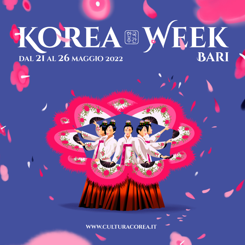 Si terrà domani, mercoledì 18 maggio, alle ore 11.45, a Palazzo di Città, la conferenza stampa di presentazione della Korea Week, la settimana di eventi culturali dedicati alla cultura coreana che per la prima volta sbarca nel capoluogo pugliese con un programma di eventi gratuiti che si svolgeranno tra il Teatro Kursaal Santalucia, l’Officina degli esordi e il Castello Svevo di Bari.