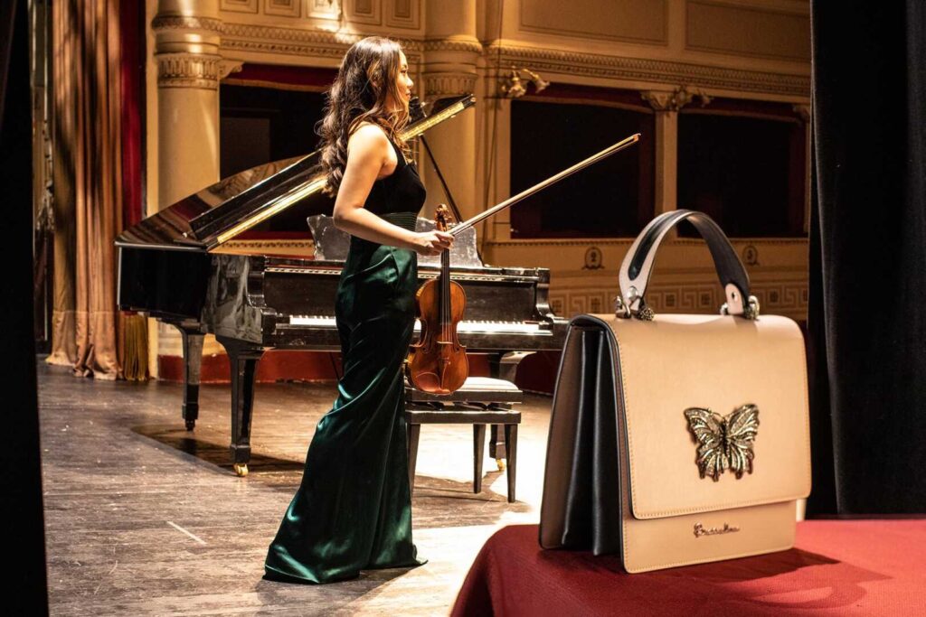 Chen, con una borsa della propria collezione a forma e tema “Violino”.