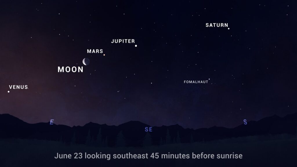 Look up starting tonight to see Venus, Mars, Jupiter, and Saturn spread out and appear to line up in the sky. The crescent moon joins them on June 23: https://t.co/36QwkIxfaw https://t.co/uh5V9W2q45Twitter – NASA