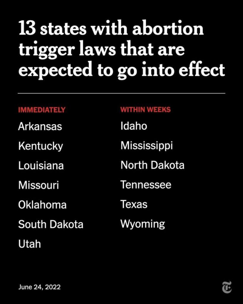 (AGENPARL) - Roma, 24 Giugno 2022The Supreme Court’s decision to overturn Roe v. Wade and give individual states the choice of banning or allowing abortions will immediately affect 13 states that have trigger laws. https://t.co/ppj1MChGaQ https://t.co/SeYIUewsM8Twitter – The New York Times