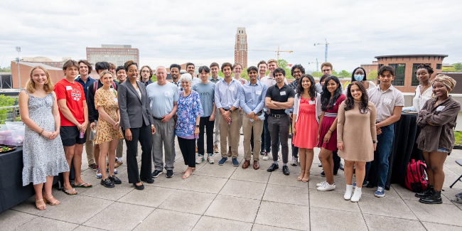 The 2022 cohort of the Nichols Humanitarian Fund gathered for a meet-and-greet event this spring with Edward C. Nichols Jr., JD’70, and his wife, Janice Nichols, who established the fund in 2006.