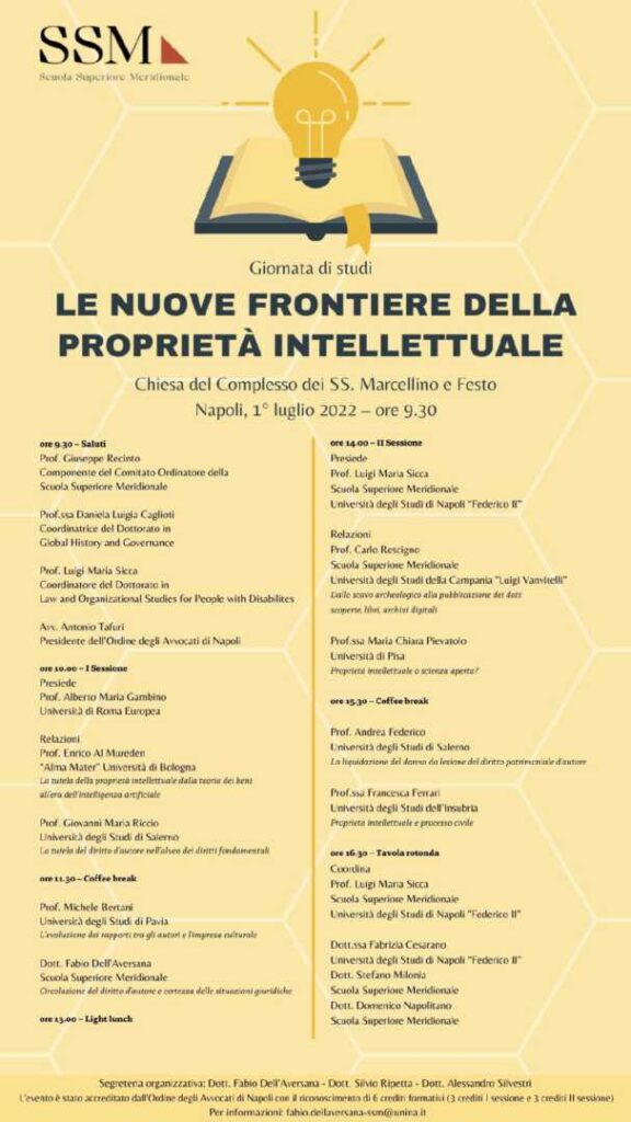 Napoli. Avrà luogo a Napoli il prossimo 1° luglio, presso la Sala del Complesso dei SS. Marcellino e Festo, la Giornata di Studi dal titolo “Le nuove frontiere della proprietà intellettuale”.