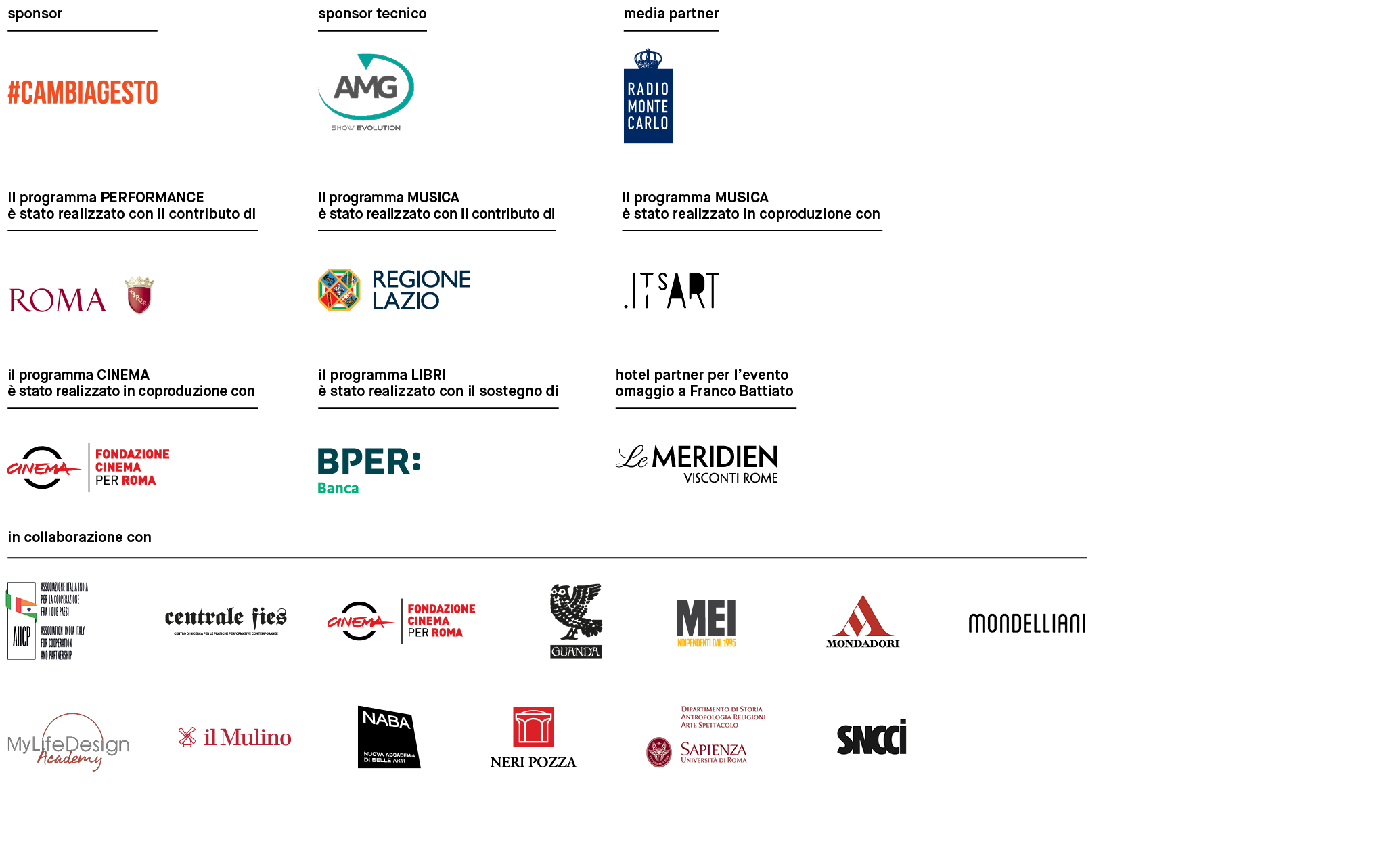 Il programma MUSICA è stato realizzato in coproduzione con ITsART e con il contributo della Regione Lazio. Il programma PERFORMANCE è stato realizzato con il contributo di Roma Capitale.