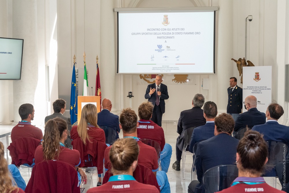 Il Capo della Polizia – Direttore Generale della Pubblica Sicurezza Prefetto Lamberto Giannini, ha incontrato questo pomeriggio presso la sede dell’Ufficio Relazioni Esterne, Cerimoniale e Studi Storici della Segreteria del Dipartimento della P. S., gli atleti delle Fiamme Oro medagliati ai mondiali di nuoto di Budapest 2022.