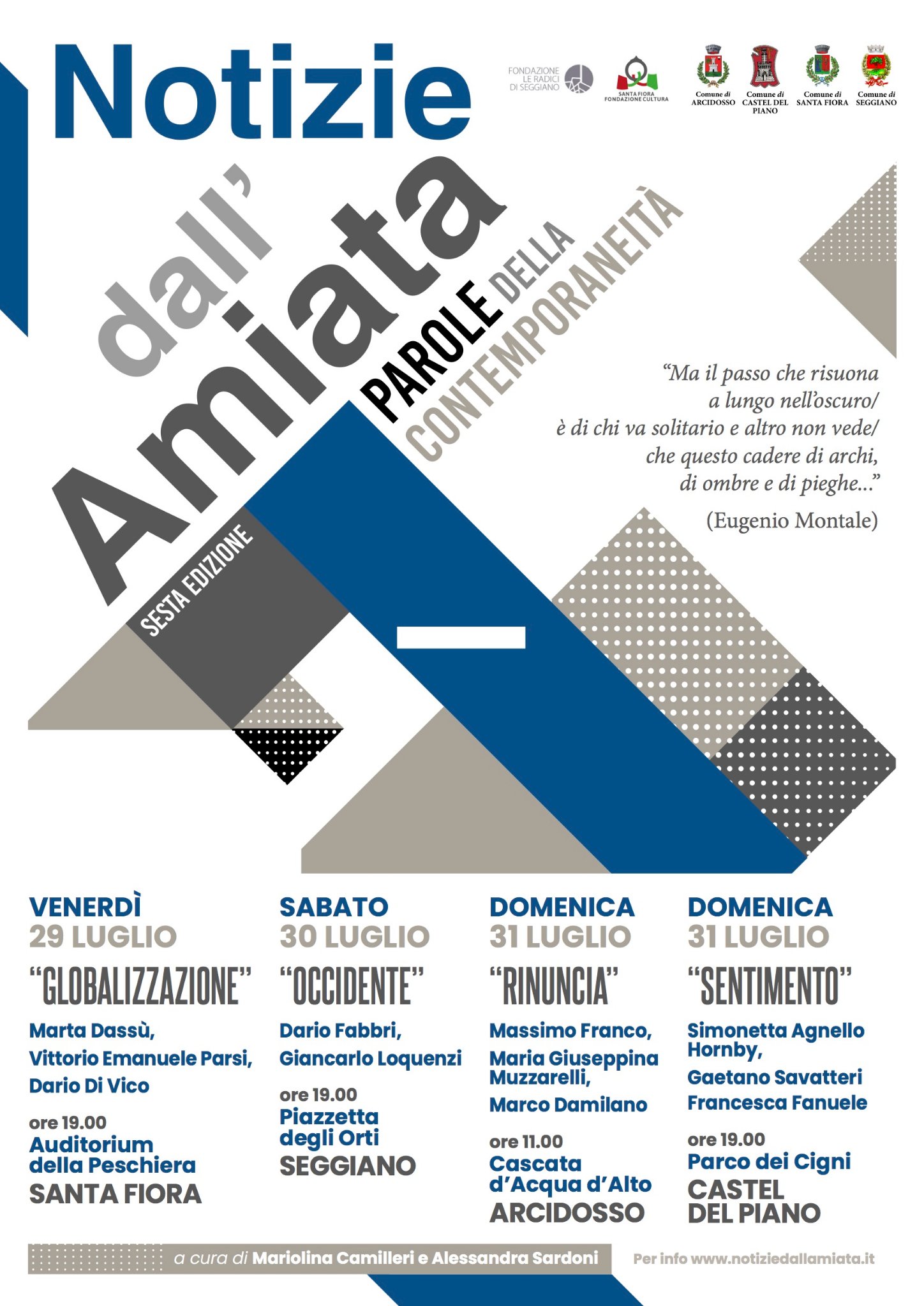 Gli incontri di Notizie dall’Amiata sono organizzati con la collaborazione dei Comuni di Arcidosso, Castel del Piano, Santa Fiora e Seggiano, insieme alla Fondazione “Le Radici di Seggiano” e alla Fondazione “Santa Fiora Cultura”.