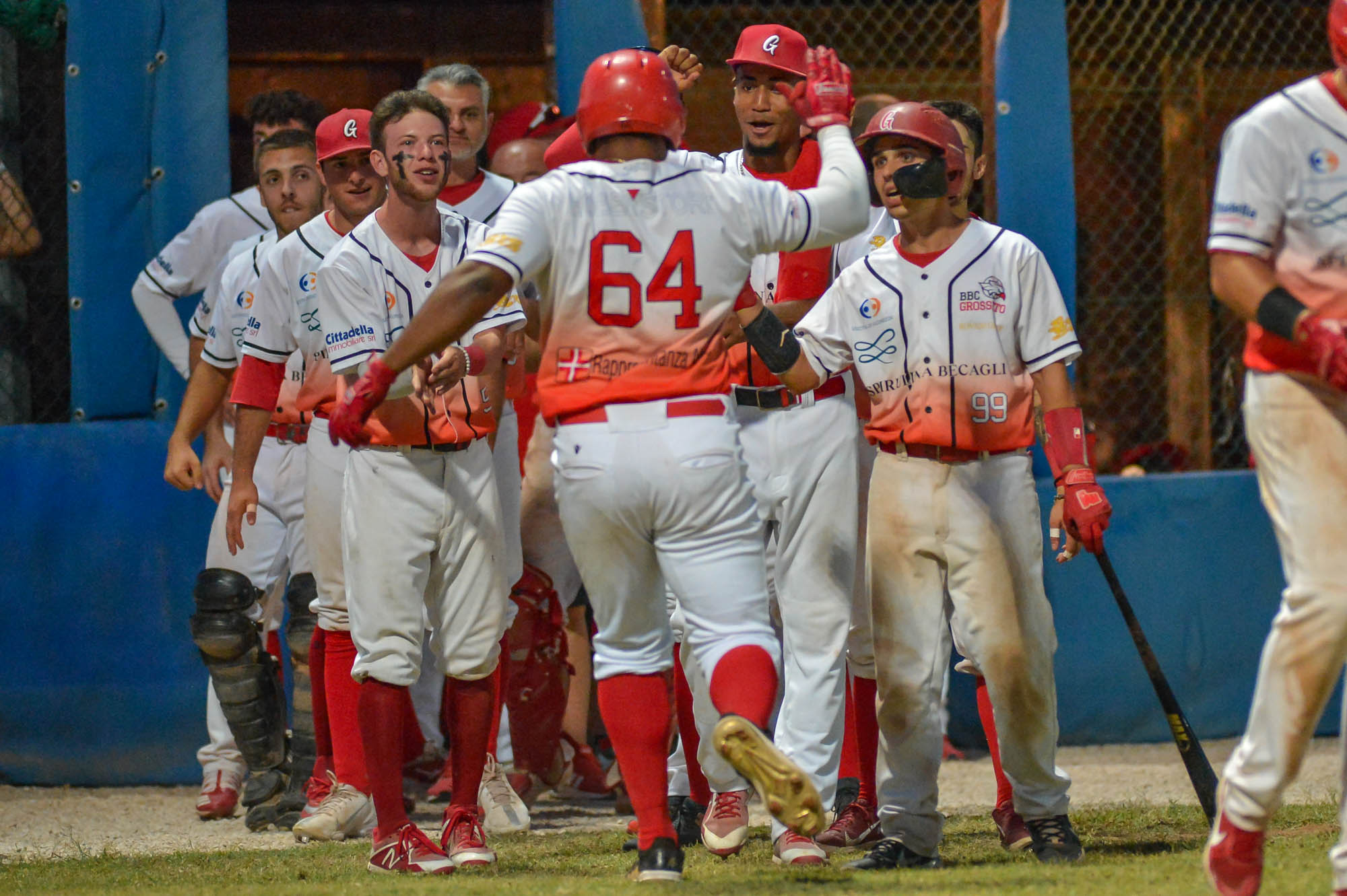 Foto: Shakir Albert (64, Spirulina Becagli Grosseto) festeggia con la squadra un fuoricampo battuto in gara3 della 1^ giornata di ritorno di poule scudetto contro l’Hort@ Godo. Credit: PhotoBass.