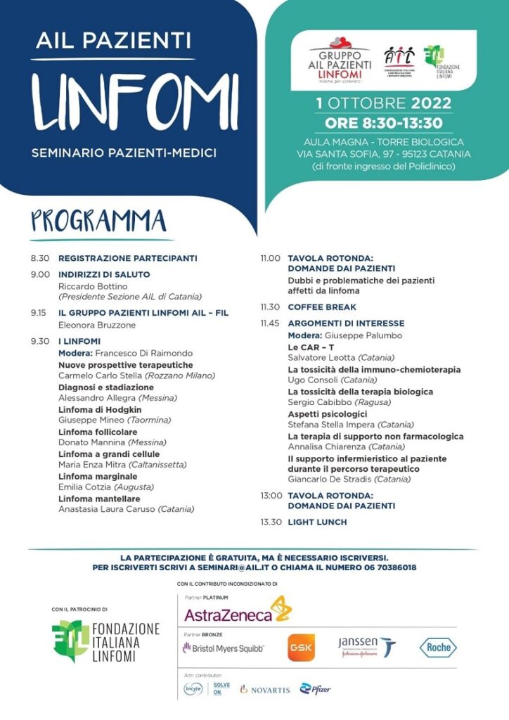 Per iscriversi alla modalità online, sarà necessario compilare il form al seguente link: [https://pazienti.ail.it/seminari/seminario-pazienti-medici-sui-linfomi-catania/](https://customer49325.musvc2.net/e/t?q=3%3dNZ7RO%26C%3d5%26D%3dOS0WPZ%26s%3dWOZ6UQ%26L%3dlJDGw_HktT_Su_IUsj_Sj_HktT_RzGeP36rJ3.2mB.3K_vqmq_66C6q982v9_BrWp_L7w570r1B0s-FuQm58K1u2em-Cy5m33-Jy9-60r69Dm-3uKeD32_vqmq_66%26x%3dDyIF46.DyK%26mI%3dOTDQQX&mupckp=mupAtu4m8OiX0wt)