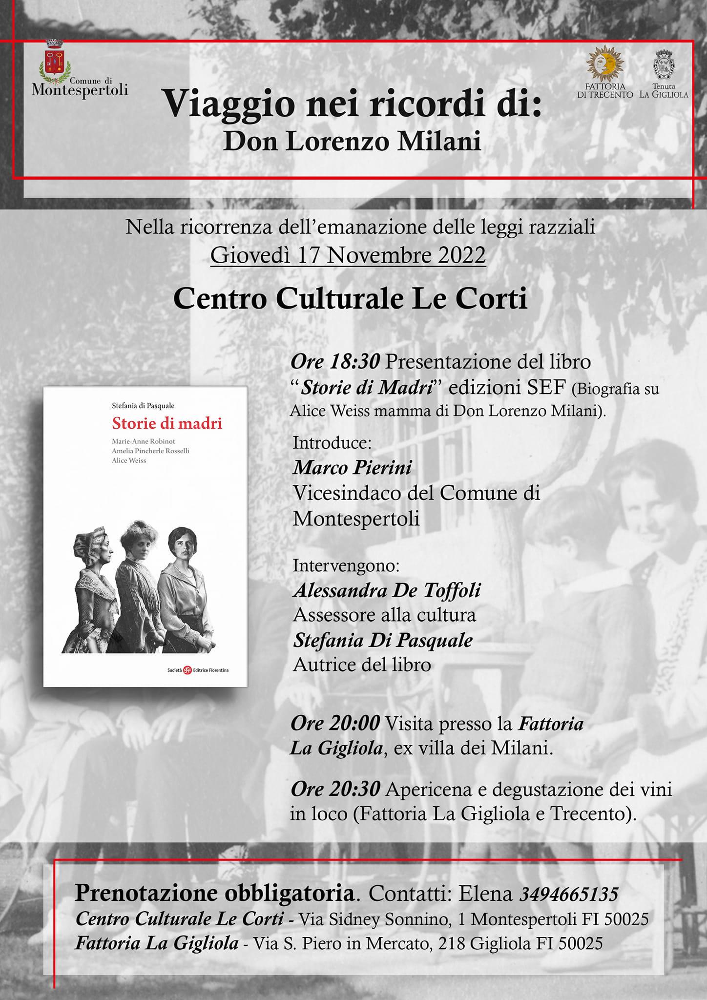 L’appuntamento è per giovedì 17 novembre al Centro culturale “Le Corti” alle ore 18:30: introduce l’evento il vicesindaco di Montespertoli, Marco Pierini e interverranno l’Assessore alla Cultura, Alessandra De Toffoli e l’autrice Stefania di Pasquale. La serata si concluderà con una visita con apericena e degustazione vini delle cantine La Gigliola e Fattoria Trecento presso la Fattoria La Gigliola, villa che apparteneva alla famiglia Milani.