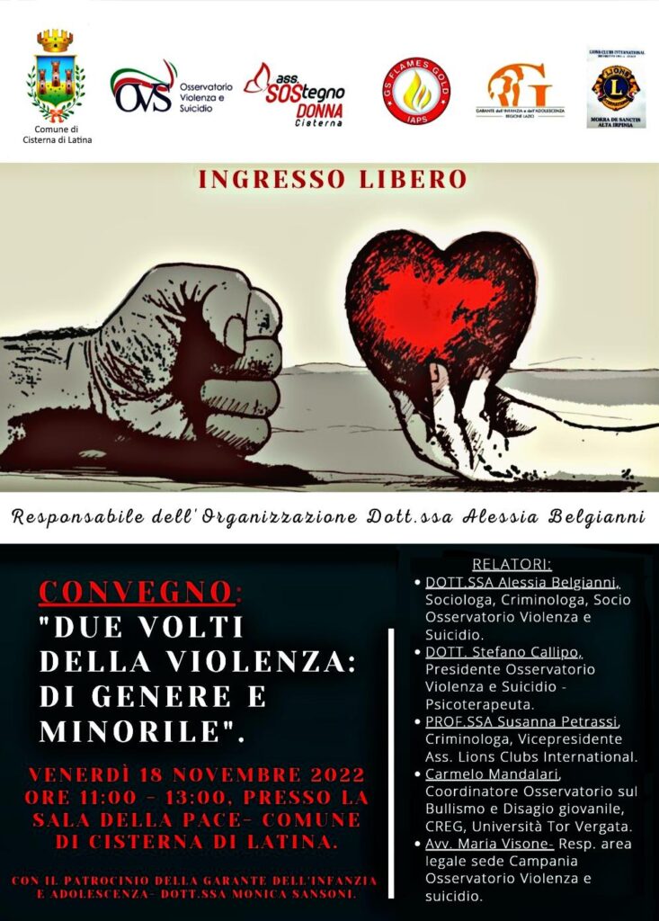 Promosso dall’Osservatorio Violenza e Suicidio, con la partecipazione dell’associazione Sostegno Donna Cisterna e il patrocinio del Comune di Cisterna, interverranno autorevoli esperti di vari settori per discutere sulle tante questioni e problematiche toccate dal fenomeno della violenza.