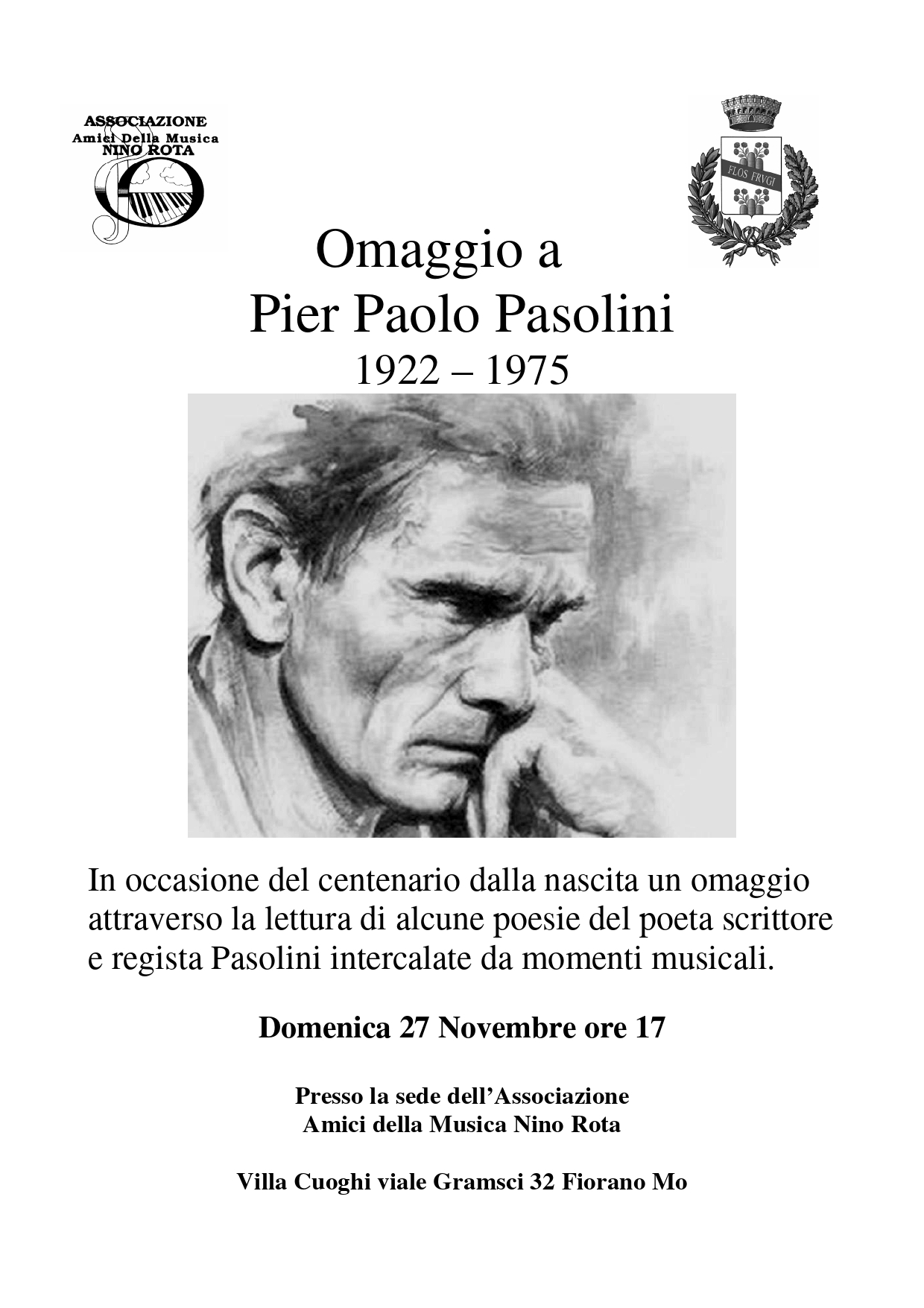 Appuntamento domenica 27 novembre presso Villa CuoghiIn occasione del centenario dalla nascita di Pier Paolo Pasolini – uno dei più celebri intellettuali del ‘900 – l’associazione fioranese Amici della Musica “Nino Rota” omaggerà il poeta, scrittore e regista attraverso la lettura di alcune poesie.