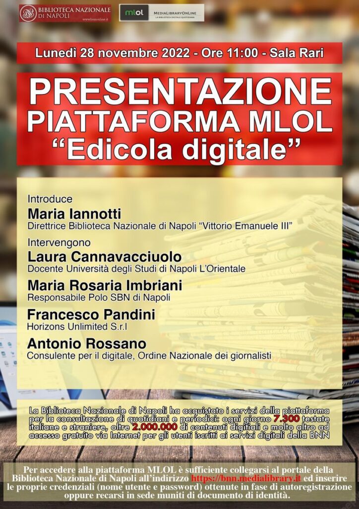 Maria Iannotti, direttrice della Biblioteca Nazionale di Napoli, Laura Cannavacciuolo, Università Orientale, Maria Rosaria Imbriani, responsabile Polo SBN Na, Francesco Pandini, Horizons Unlimited, Antonio Rossano, Consulente per il digitale ODG, illustreranno tutte le potenzialità del servizio, le modalità di fruizione e di registrazione per accedere al servizio.