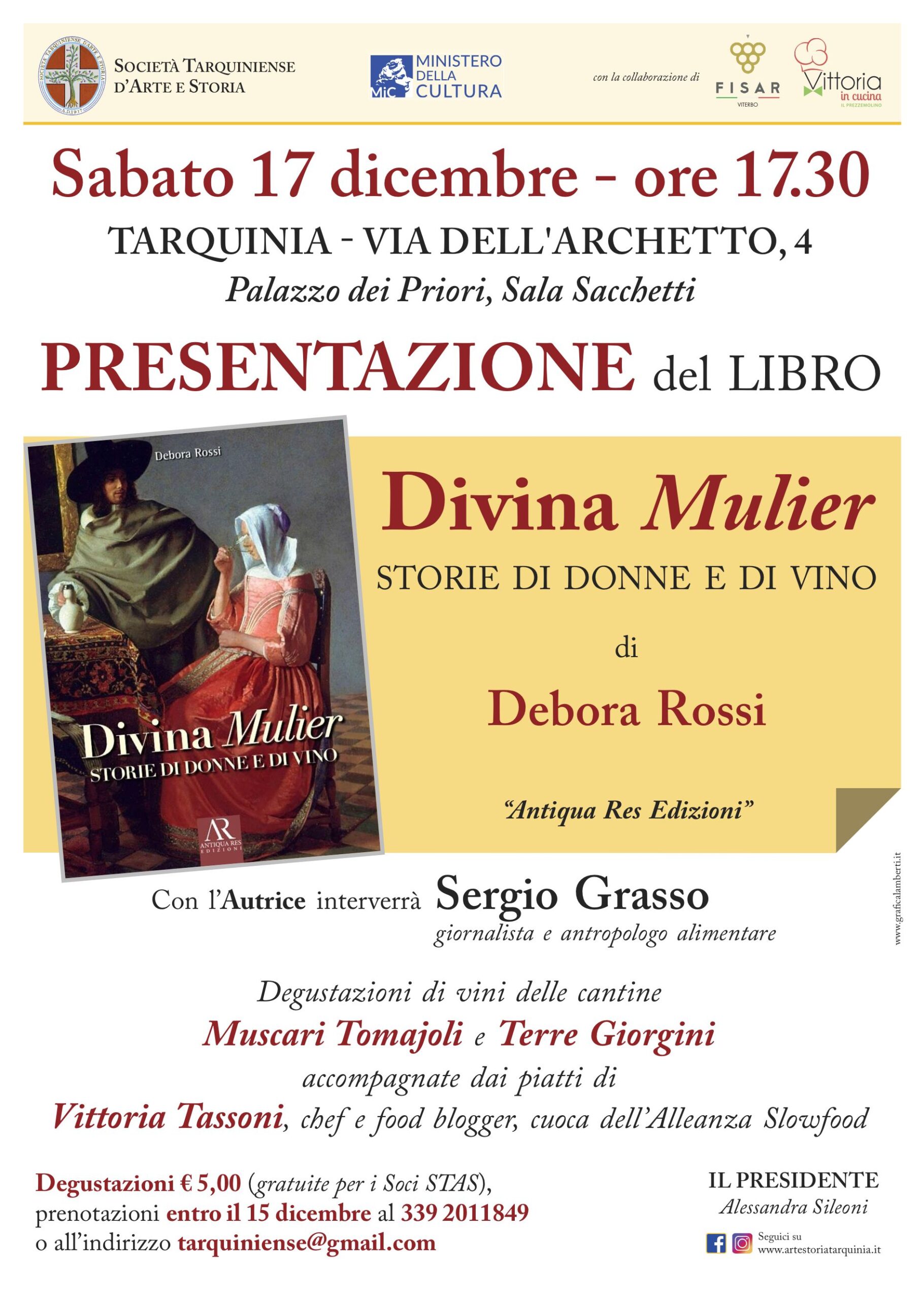 Sabato 17 dicembre, alle 17,30, a Tarquinia, al civico 4 di via dell’Archetto. A seguire la degustazione di vini delle aziende Muscari e Giorgini, accompagnata dai piatti della chef Vittoria Tassoni