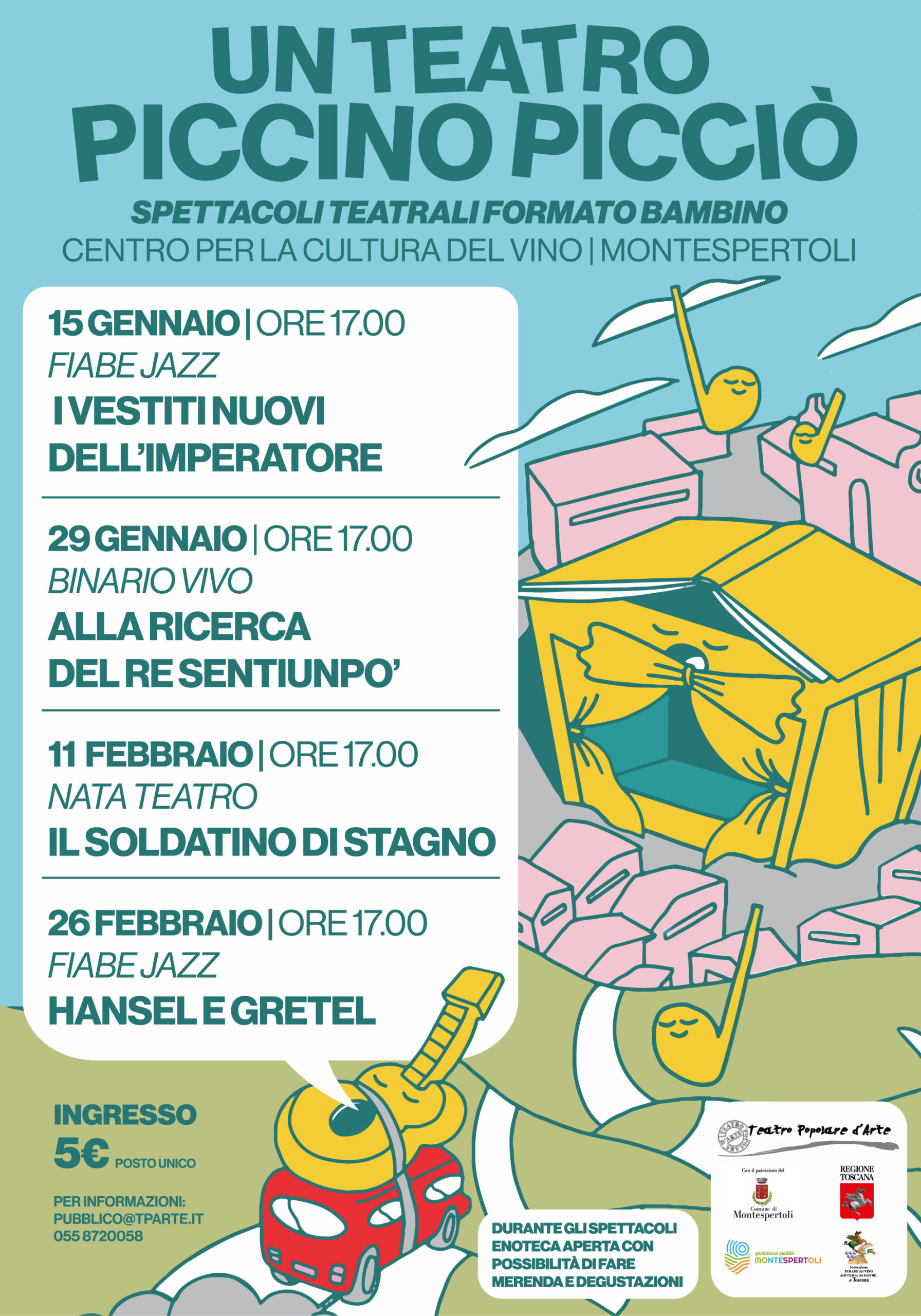 Il Teatro Popolare d’Arte porta a Montespertoli una rassegna teatrale invernale che punta all’incontro tra famiglie in un luogo rinnovato, tra il Museo del Vino e della Vite e la neonata Enoteca “I Lecci”. Infatti durante gli spettacoli sarà attiva l’enoteca con possibilità di fare merenda e degustazioni. Lo spazio dell’Auditorium con i suoi cento posti sarà riadattato per l’occasione diventando un vero e proprio Teatro Piccino Picciò.