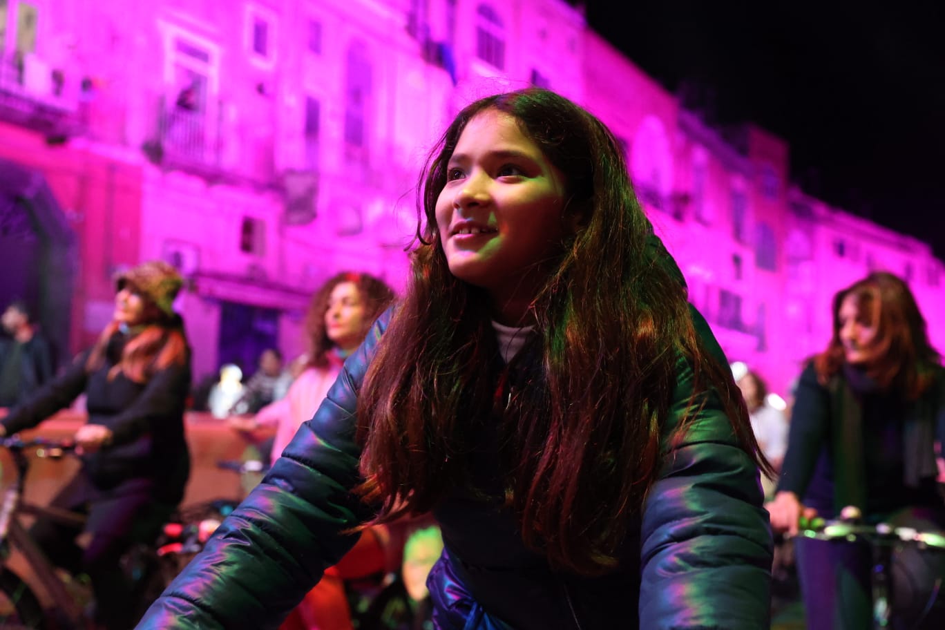 Oltre 200 cittadini vestiti di rosa, il colore di Procida 2022, alimentano il Palco a Pedali generando energia elettrica pedalando con le loro biciclette agganciate a uno speciale cavalletto collegato a una dinamo per tutta la durata dello spettacolo. E sintetizzando così il ruolo attivo, fondamentale, che la cittadinanza ha recitato nel corso dell’anno da Capitale Italiana della Cultura.