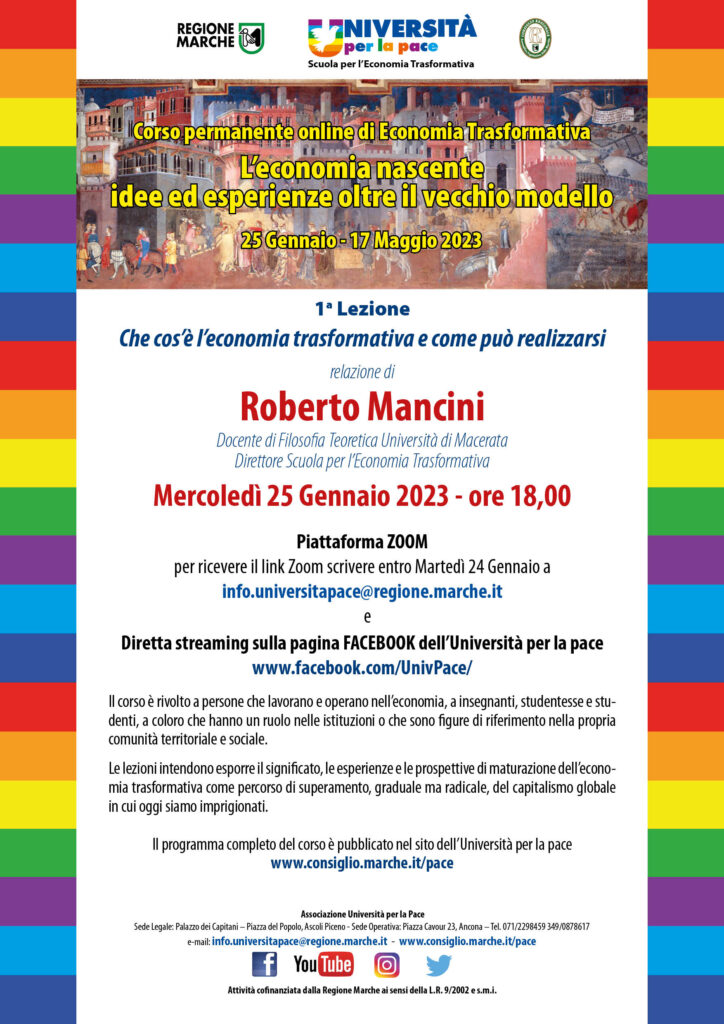 La prima lezione, intitolata “Che cos’è l’economia trasformativa e come può realizzarsi”, è in agenda mercoledì 25 gennaio alle 18. Sarà tenuta da Roberto Mancini, direttore della Set e Docente di Filosofia Teoretica all’Università di Macerata.