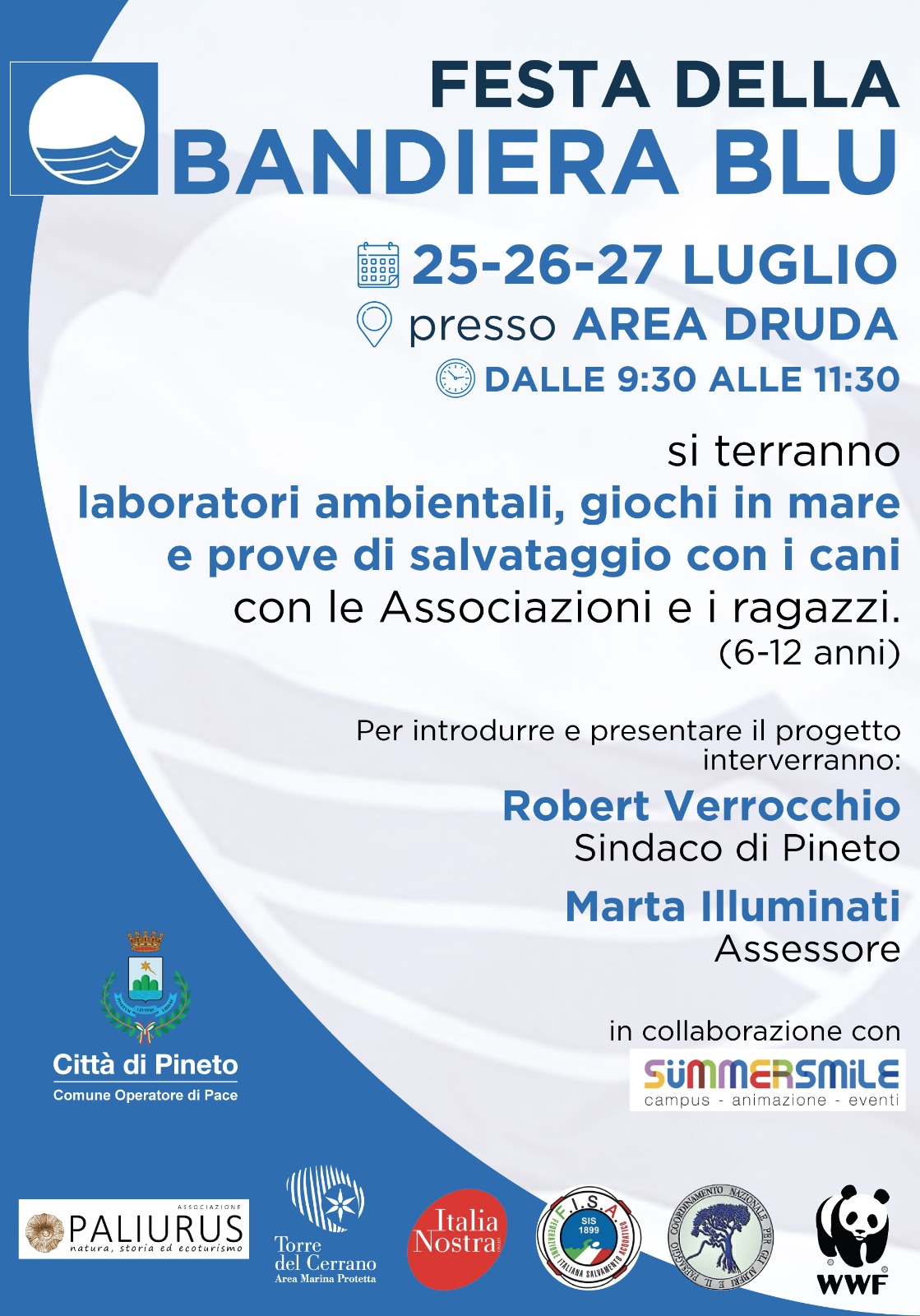 PINETO. È in programma per il 25, 26 e 27 luglio 2023 – dalle 9,30 alle 11,30 – a Pineto, nell’Area Druda, la Festa della Bandiera Blu. In programma laboratori ambientali, giochi in mare e prove di salvataggio con i cani con le associazioni e i ragazzi dai 6 ai 12 anni. Per introdurre e presentare il progetto interverranno il Sindaco di Pineto, Robert Verrocchio e l’assessora all’Ambiente Marta Illuminati. L’iniziativa, patrocinata dal Comune di Pineto, è una delle occasioni per festeggiamenti l’ambito vessillo ed è organizzata in collaborazione con l’associazione Summersmile e in sinergia con l’associazione Paliurus, il WWf, il coordinamento nazionale per gli alberi e il paesaggio, l’AMP Torre del Cerrano, Italia Nostra e la FISA (federazione Italiana Salvamento Acquatico).