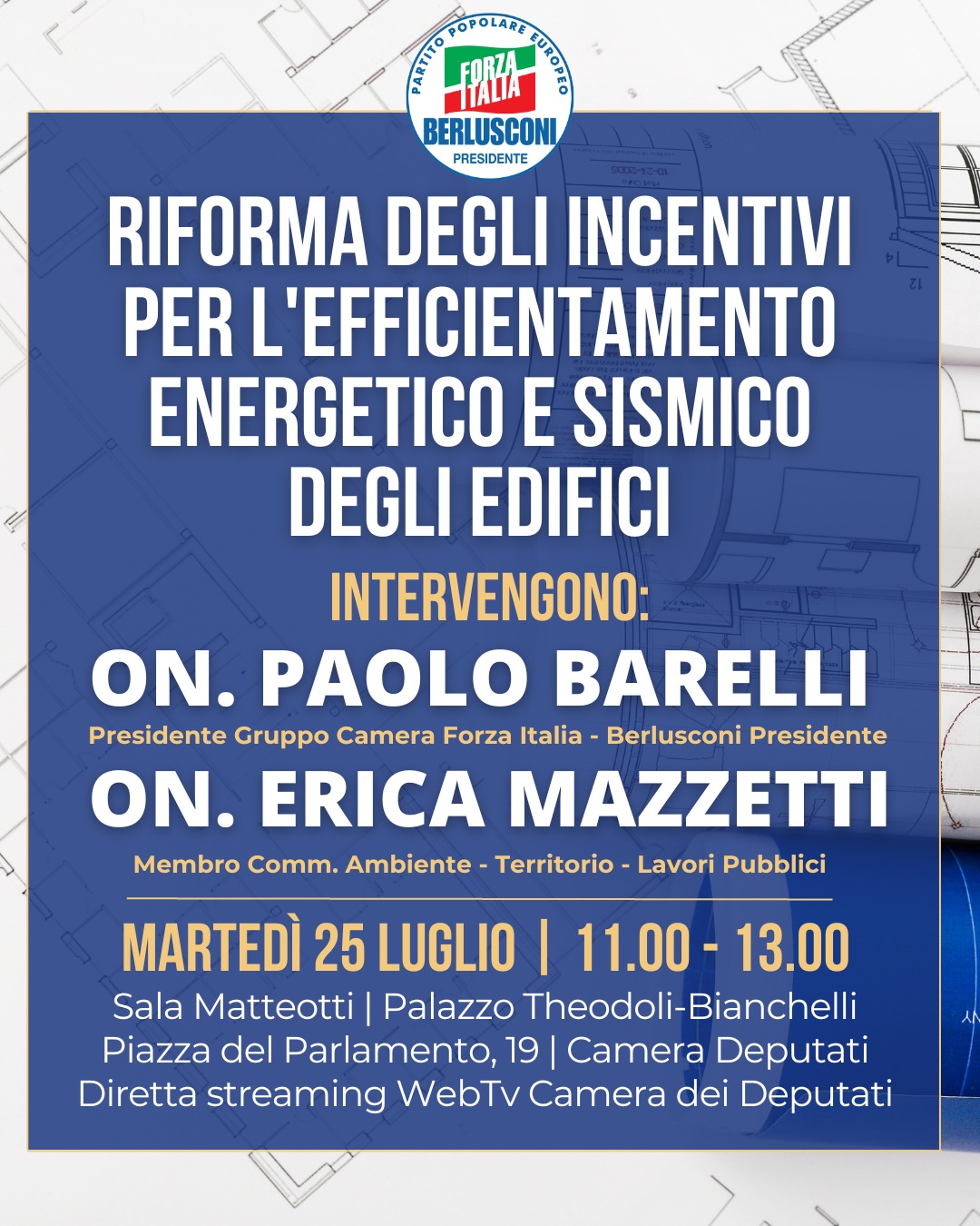 Riordinare e semplificare gli incentivi edili ma anche stabilizzarli e renderli più accessibili per i meno abbienti, con ricadute benefiche sulla filiera delle costruzioni e sull’ambiente. Sono questi alcuni dei punti cardine della proposta di riforma degli incentivi a prima firma Erica Mazzetti, parlamentare di Forza Italia, che verrà presentata martedì 25 luglio a partire dalle ore 11:00 presso la Sala Matteotti di Palazzo Theodoli-Bianchelli. Insieme a Mazzetti, interverrà Paolo Barelli, Presidente del Gruppo Camera di Forza Italia. A margine, ci sarà spazio per le riflessioni di categorie economiche, ordini professionali e imprese. Diretta in contemporanea sulla webtv della Camera.