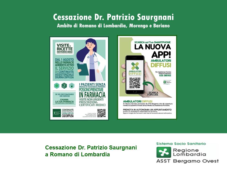 Come comunicato da ATS Bergamo, si informa che il dr. Patrizio Saurgnani, Medico di Medicina Generale nell’ambito di Romano di Lombardia, Morengo e Bariano, cesserà la propria attività Sabato 29 luglio 2023 (ultimo giorno lavorativo: 28/07/2023).