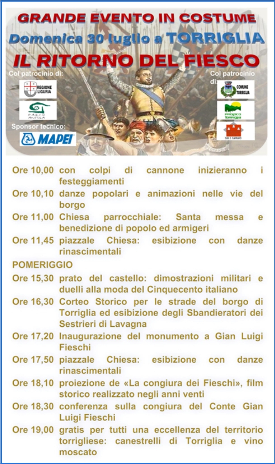 “La propaganda dei Doria ha devastato l’immagine di quest’uomo, cucendogli addosso persino la favola di una morte stupida – In realtà non fu così, Gian Luigi progettò e condusse in modo eccellente il piano per prendere il controllo di Genova e fu davvero solo la sfortuna a sconfiggerlo. Quanto alla sua morte, persino Andrea Doria in una lettera chiarisce che non “scivolò†in mare pesantemente corazzato, ma cadde in acqua colpito alla fronte da un’archibugiata mentre guidava coraggiosamente l’assalto alla galea Capitana dei Doria, indossando sugli abiti solo una leggera corazzina da abbordaggio. Così terminò in Italia la grande storia dei Fieschi di Torriglia, la famiglia dei due papi e degli infiniti cardinali, vescovi, uomini d’armi e di stato, ammiragli e quant’altro. Quella di domenica non è, o almeno non solo, una festa fliscana. É soprattutto la festa di Torriglia che vuole così riappropriarsi del proprio notevolissimo passato, quando fu capitale di un grande principato doriesco, che comprendeva la più parte delle nostre valli montane, estendendosi nell’alessandrino, nel piacentino, nel parmense. O prima ancora quando fu appunto patria dei Fieschi di Torriglia, allora centro di uno stato ancora più grande, che arrivava sino al nord della Toscanaâ€.
