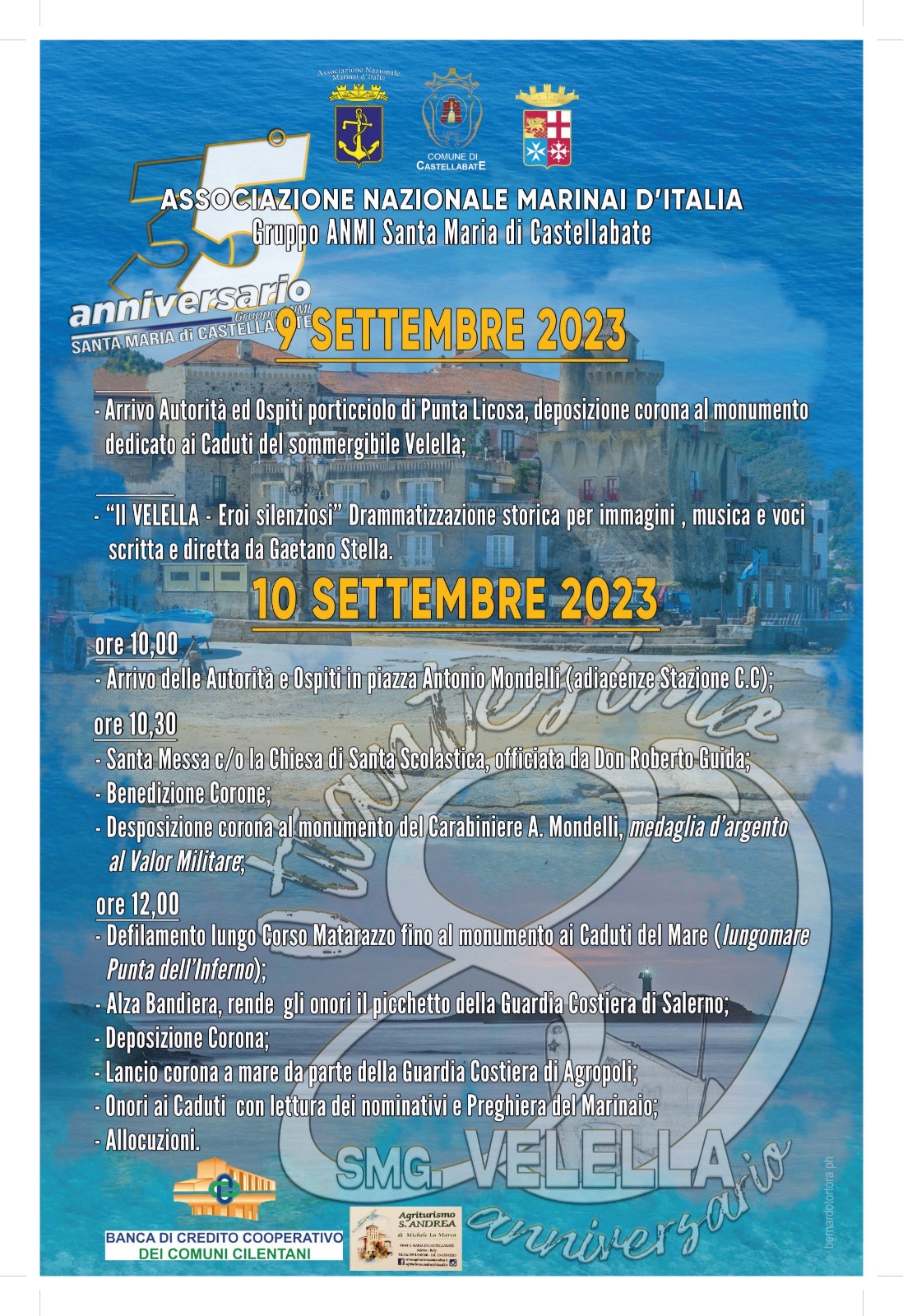 La tragedia di questo Sommergibile rappresenta una triste pagina della storia di Castellabate, parte essenziale della nostra identità. Un anniversario che ogni anno è sempre più sentito e condiviso, una cerimonia ufficiale per rendere onore all’encomiabile operato reso durante le missioni e al suo equipaggio deceduto durante l’affondamento. Proprio per l’importanza di questo anniversario, sono state organizzate dal Comune di Castellabate e dall’A.N.M.I. sezione di Castellabate- Gruppo Sommergibile Caduti del Velella, in sinergia con l’associazione Il Faro di Licosa due giornate interamente dedicate a questa commemorazione. Per rendere onore agli eroi silenziosi del Velella il 9 settembre, dopo la deposizione della corona al monumento a loro dedicato sul Molo di Punta Licosa andrà in scema la drammatizzazione storica per immagini, musica e voci scritta e diretta da Gaetano Stella. In Santa Maria le celebrazioni ufficiali si svolgeranno il 10 settembre a partire dalle ore 10:00 in Piazza Mondelli.