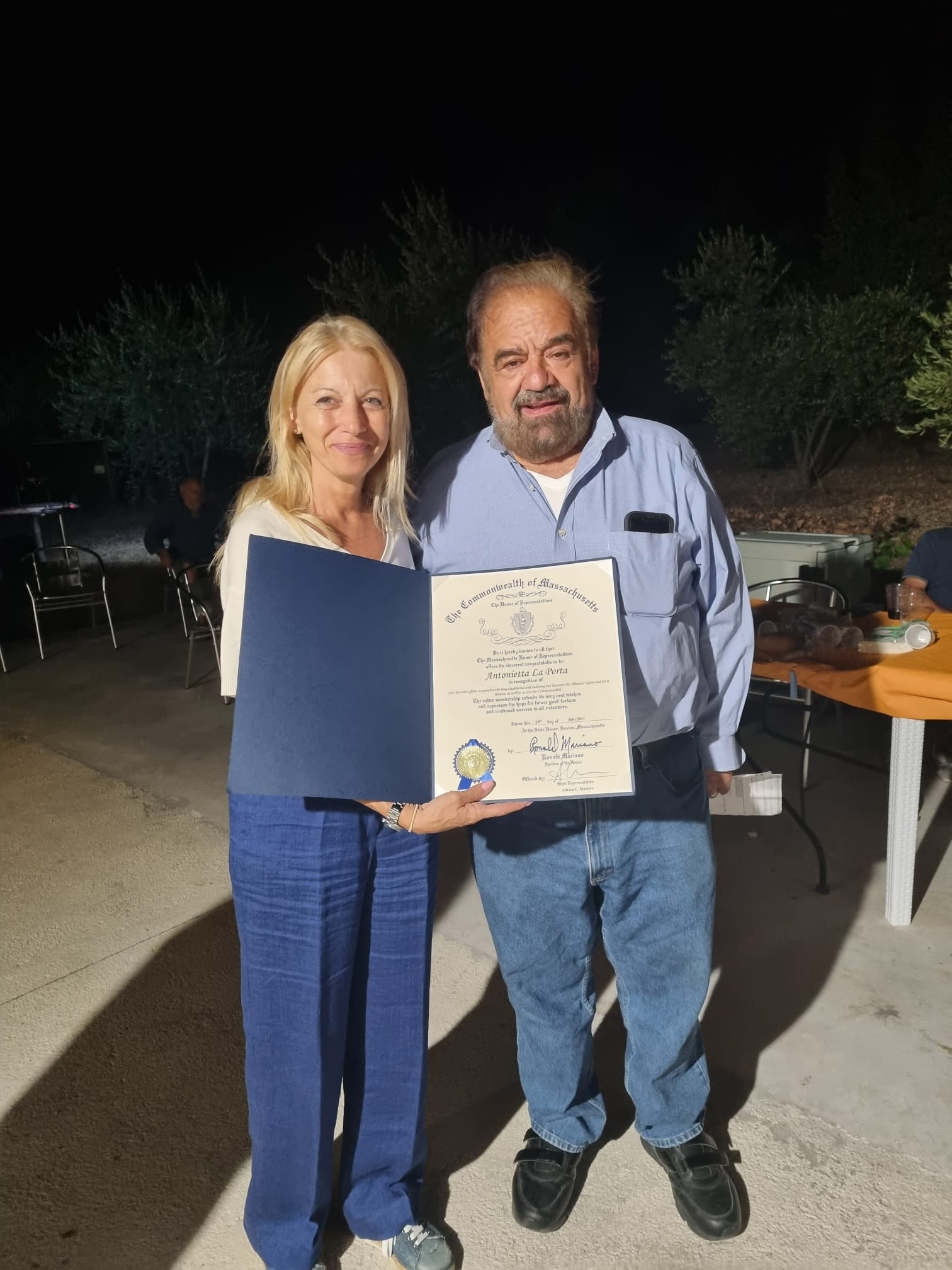 (ACRA) – L’Aquila, 5 settembre – Antonietta La Porta si dice orgogliosa per il riconoscimento ricevuto della Camera dei rappresentanti del Massachusetts, “in riconoscenza della devozione per preservarne i legami tra l’Abruzzo, Sulmona e Boston”. Il consigliere regionale ha così affidato allo chef italo-americano Filippo Frattaroli una lettera di ringraziamento, indirizzata al presidente Mariano, per ringraziarlo “del prestigioso riconoscimento, esprimendo orgoglio e al tempo stesso l’impegno di consolidare la collaborazione per mantenere sempre vivi i legami tra l’Abruzzo, Sulmona e Boston”. A questo proposito, il consigliere regionale ha evidenziato come si stiano portando avanti una serie di iniziative “che, grazie al nostro concittadino Filippo Frattaroli, coinvolgeranno la nostra regione e lo Stato del Massachusetts”. La pergamena, firmata dal presidente Ronald Mariano a nome dei 160 membri della Camera e consegnata ad Antonietta La Porta dallo chef Frattaroli, auspica “la speranza per un buon futuro pieno di successi per tutti i progetti che saranno portati avanti tra il Massachusetts e L’Abruzzo”. (red)