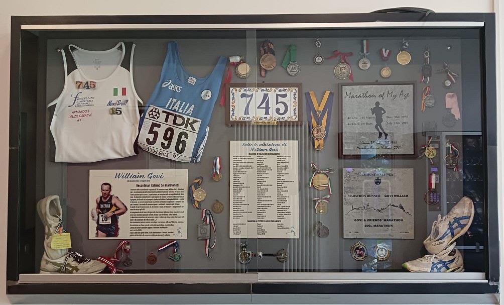 maratoneta albinetano William Govi. La vetrina contiene tantissime medaglie,