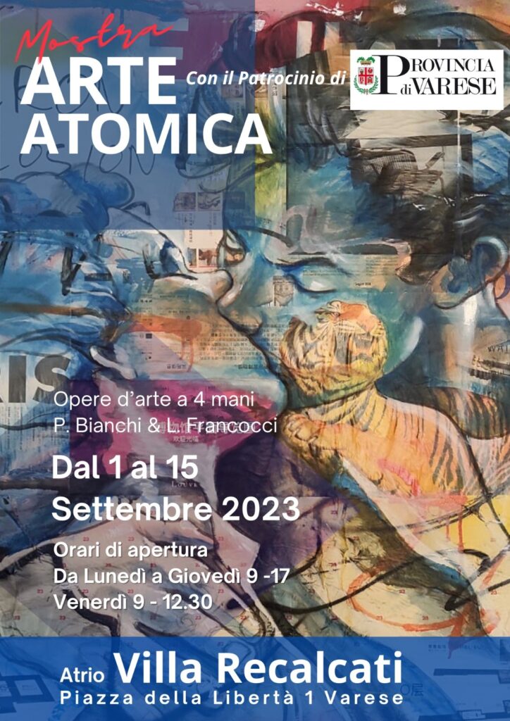 Varese – 6 settembre 2023: “Arte Atomica”, una ricerca a quattro mani definita tale dai suoi creatori Paolo Bianchi e Luca Francocci, due artisti che da vent’anni si dedicano a questa sorprendente forma d’arte che cattura gli occhi e il cuore con tutta la sua carica espressiva.L’ “Arte Atomica” è un nuovo linguaggio artistico in cui le sovrapposizioni e le compenetrazioni di concetti e di immagini invitano l’osservatore alla ricerca di percorsi visivi dagli infiniti significati.Opere d’arte che racchiudono due diverse personalità pronte ad esplodere su tela in un lavoro a quattro mani.E le mani sono ovviamente quelle di Luca Salvatore Francocci (Varese 1965), artista surrealista laureato alla scuola IED in illustrazione, esperto nell’utilizzo di pitture acriliche, olio e di arte digitale e quelle di Paolo Bianchi (Varese 1970), autodidatta legato alla poetica del Nouveau Realisme, dalla trasformazione dell’oggetto del passato (libri giornali manifesti strappati dai muri) in una sorta di nuova reliquia incollata e rinnovata.