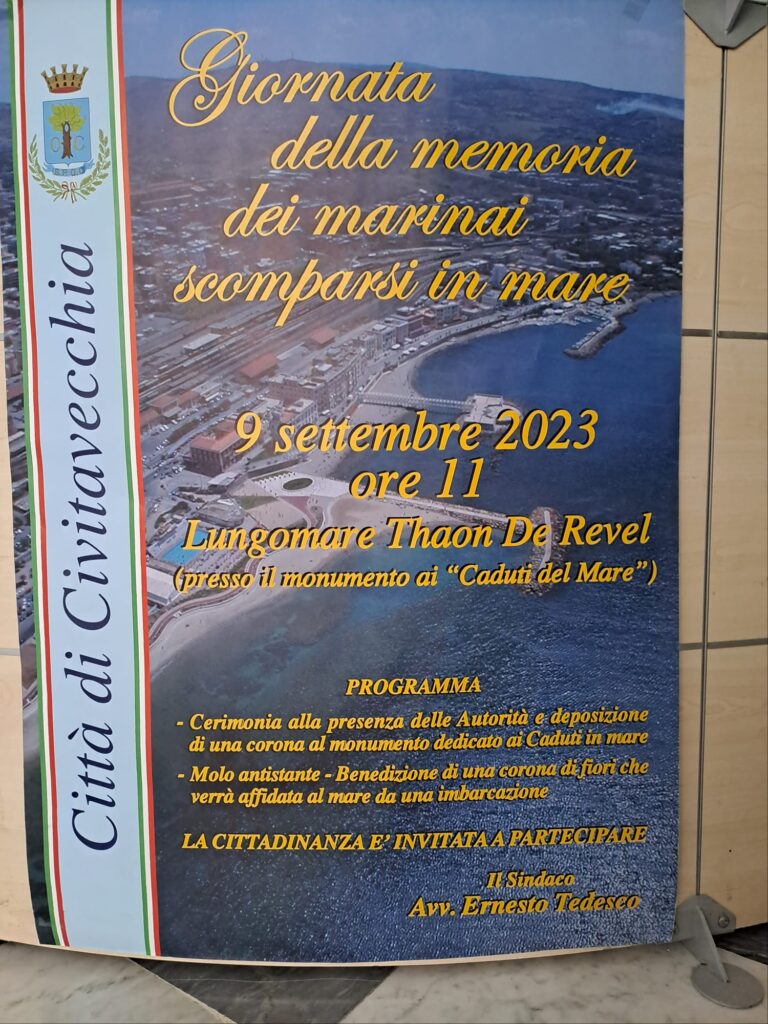 CIVITAVECCHIA, 8 SETTEMBRE 2023 – domani, giovedì 9 settembre alle 11:00, come ogni anno Civitavecchia onorerà la “Giornata della memoria dei marinai scomparsi in mare”. La cerimonia sarà celebrata sul lungomare Thaon de Revel presso il monumento ai Caduti del Mare, in largo dei Tirreni.