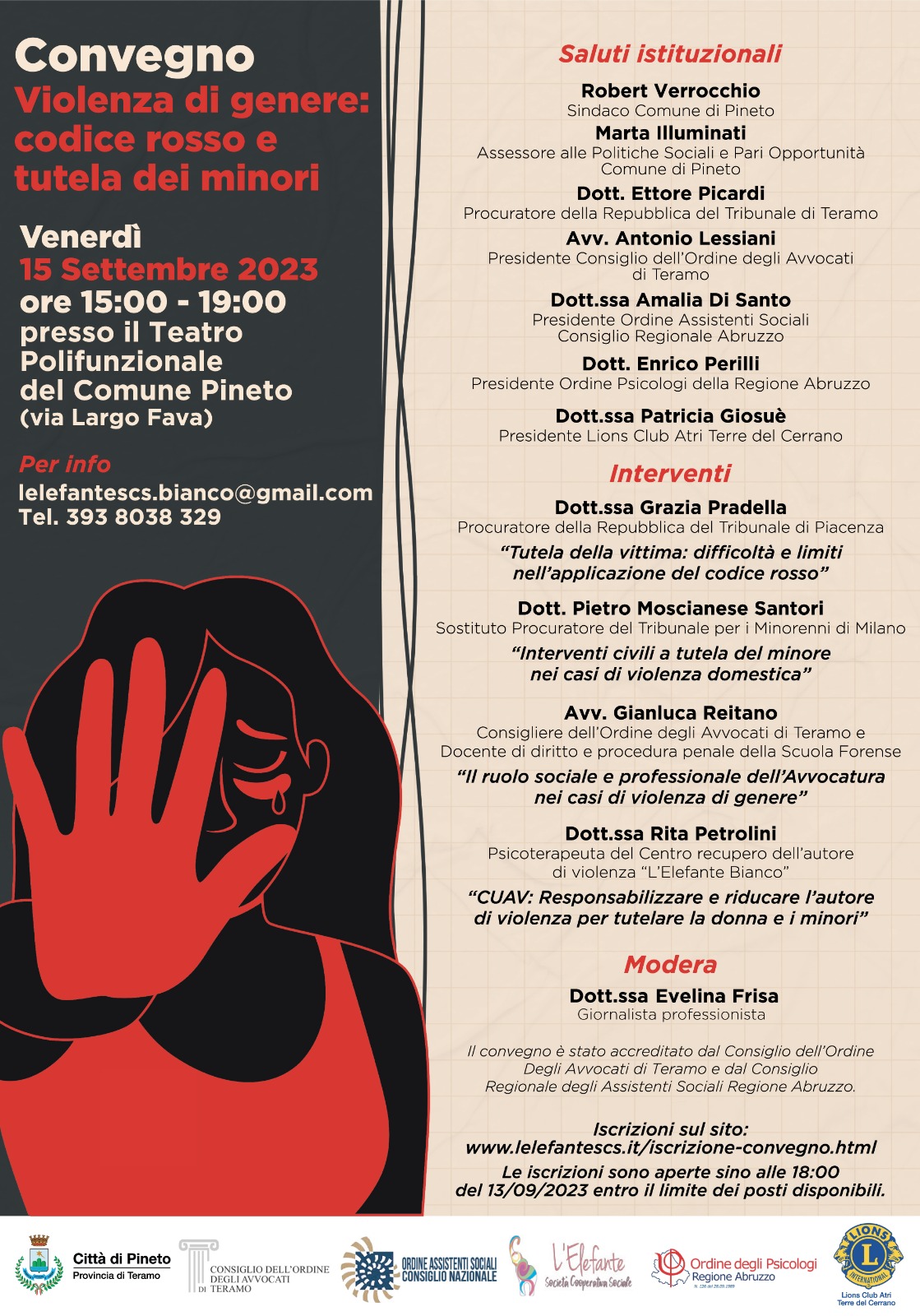 PINETO. “Violenza di genere: codice rosso e tutela dei minori” è questo il titolo del convegno in programma a Pineto, nel Teatro Polifunzionale, per venerdì 15 settembre 2023 dalle 15, iniziativa a cura dell’Assessorato alle Politiche Sociali del Comune di Pineto in collaborazione con la Società Cooperativa Sociale L’Elefante, con il patrocinio del Consiglio dell’Ordine degli Avvocati di Teramo, dell’Ordine degli Assistenti Sociali Consiglio Regionale Abruzzo, dell’Ordine degli Psicologi della Regione Abruzzo e del Lions Club Atri Terre del Cerrano. Interverranno, moderati dalla giornalista Evelina Frisa, esperti di chiara fama a livello nazionale come Grazia Pradella, Procuratore della Repubblica del Tribunale di Piacenza (nota per aver seguito alcuni dei casi di giustizia più complessi, dalla strage di Piazza Fontana a Milano al caso di Pier Paolo Brega Massone, l’ex primario di Villa Rita, ribattezzata la «clinica degli orrori», sempre a Milano, ma anche di Tangentopoli, terrorismo internazionale e servizi segreti deviati) la quale interverrà sul tema “Tutela della vittima: difficoltà e limiti nell’applicazione del codice rosso”; Pietro Moscianese Santori, Sostituto Procuratore del Tribunale per i Minorenni di Milano sugli “Interventi civili a tutela del minore nei casi di violenza domestica”, Gianluca Reitano, Consigliere dell’Ordine degli Avvocati di Teramo e docente di diritto e procedura penale della Scuola Forense il quale interverrà sul ”ruolo sociale e professionale dell’Avvocatura nei casi di violenza di genere” e Rita Petrolini, psicoterapeuta del Centro recupero dell’autore di violenza L’Elefante Bianco con un intervento dal titolo “CUAV: Responsabilizzare e rieducare l’autore di violenza per tutelare la donna e i minori”.