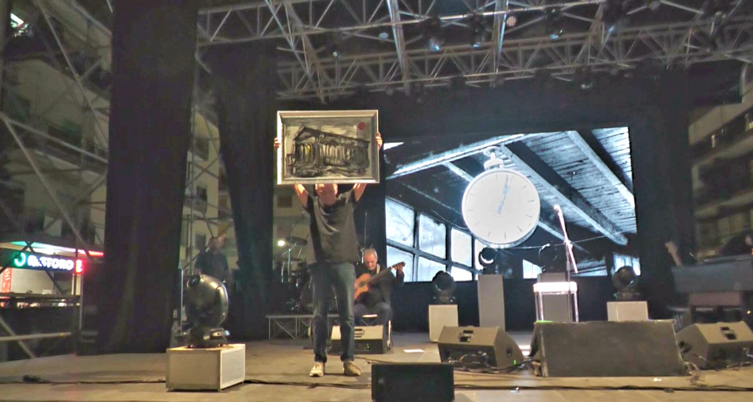e apre il concerto sollevando al cielo la tela di Mangone: in primo piano