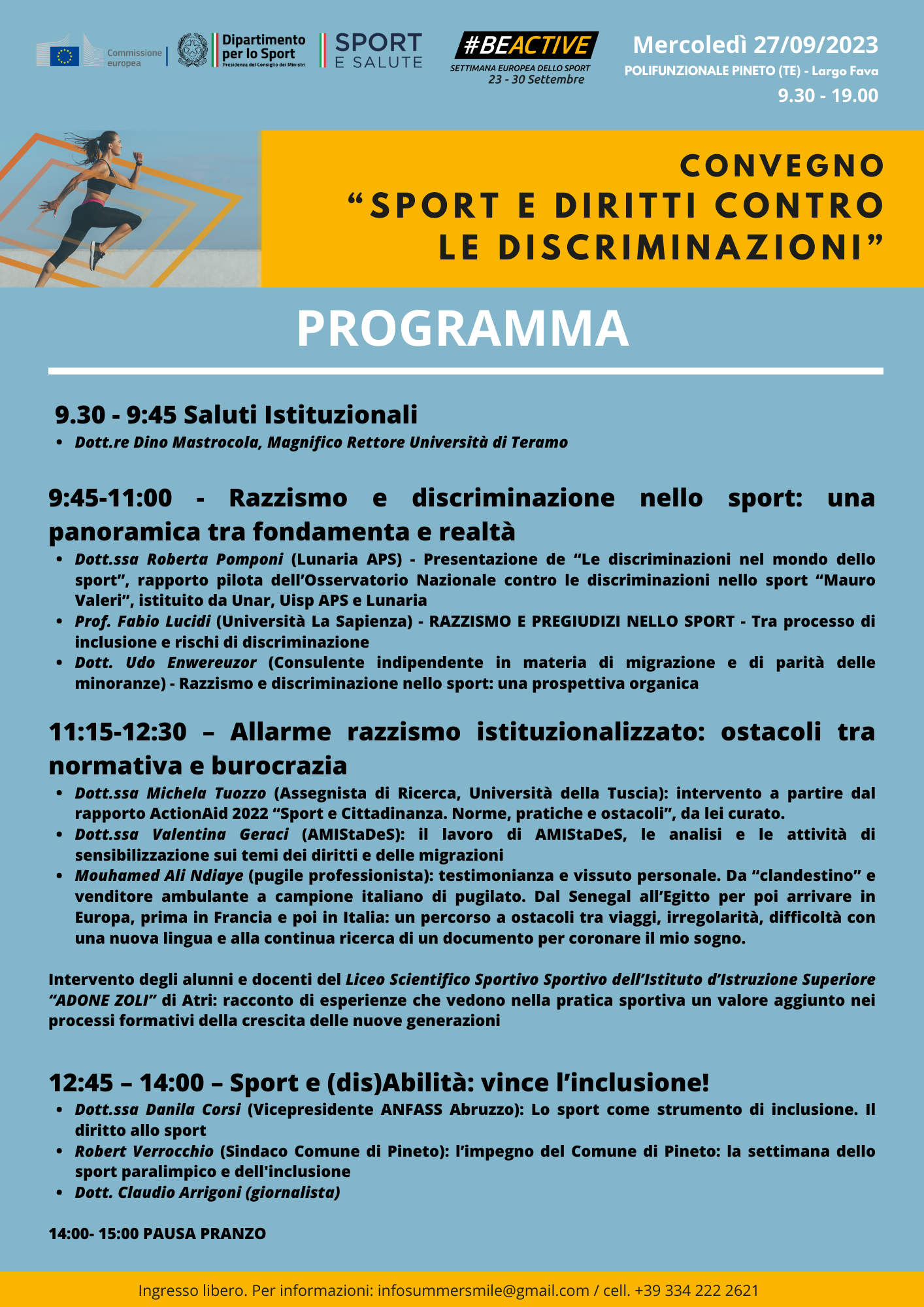 Il primo evento – Mercoledì 27 Settembre dalle 9.30 alle 19.000 – è il convegno gratuito “Sport e diritti contro la discriminazione”, che si terrà presso il centro Polifunzionale di Pineto e vedrà susseguirsi nell’arco della giornata una serie di interventi, che coinvolgeranno istituzioni del territorio, società sportive, associazioni, scuole e…campioni paralimpici. Notizia dell’ultima ora è infatti la presenza dell’atleta abruzzese Ylenia Colanero, campionessa paralimpica di apnea.