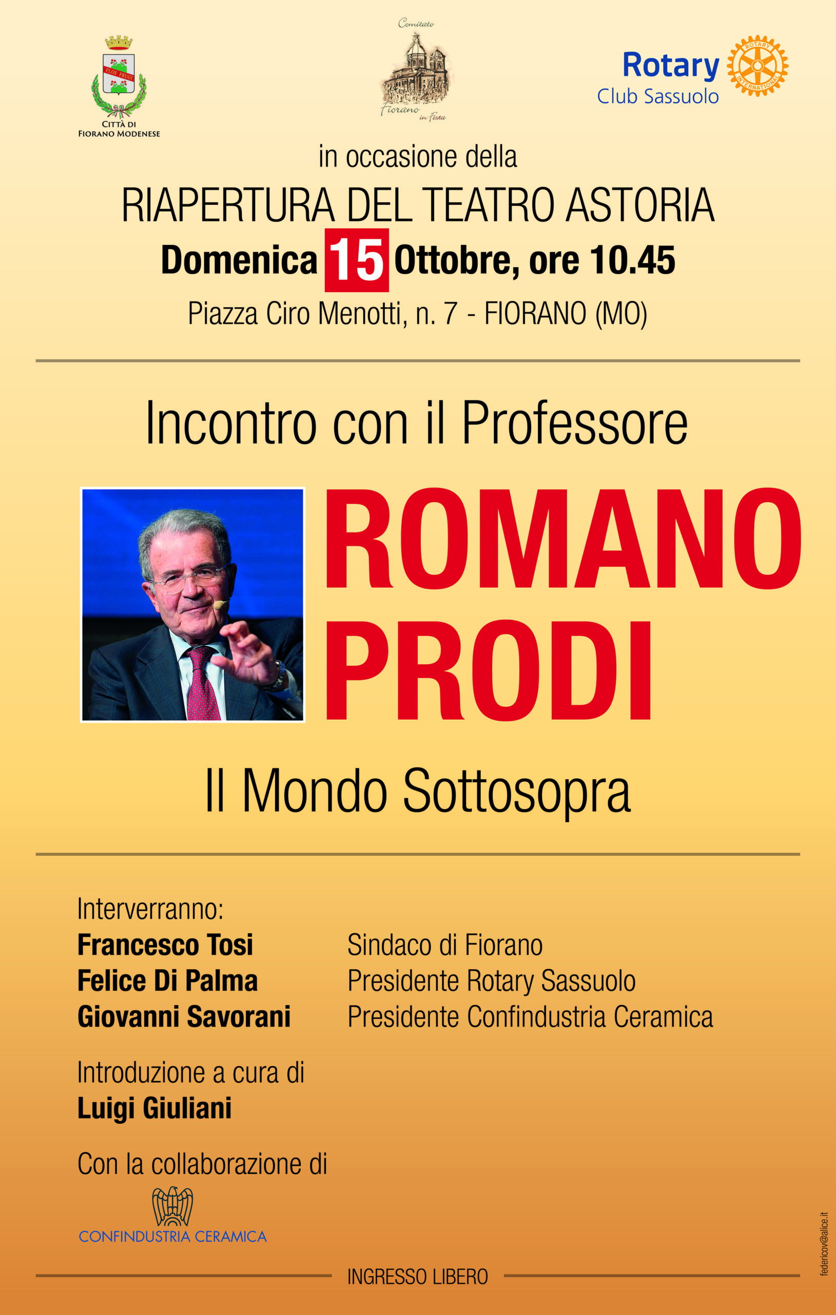 Romano Prodi da anni viene invitato in molte università del mondo per le sue conoscenze in fatto di economia e politica, per cui la sua presenza darà molto lustro all’inaugurazione dell’Astoria. Inoltre si soffermerà sul nostro Distretto ceramico, essendone sempre stato un osservatore attento. La lezione del professore sarà preceduta da un breve intervento di Giovanni Savorani, Presidente di Confindustria Ceramica, e del presidente del Rotary di Sassuolo dott. Felice Di Palma. Fiorano Modenese, 9 ottobre 2023