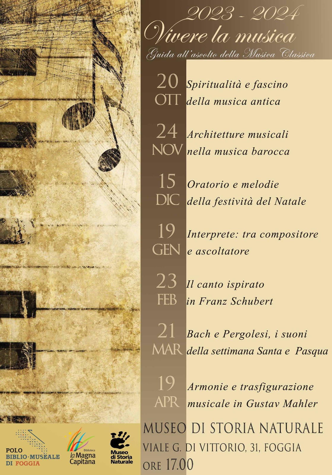 Venerdì 20 ottobre, ore 17.00, al Museo di Storia Naturale di FoggiaRiprende il 20 ottobre 2023, alle ore 17.00, presso il Museo di Storia Naturale di Foggia, il ciclo di guide all’ascolto di musica classica, dal titolo Vivere la musica, organizzato dalla Biblioteca “la Magna Capitana” di Foggia.