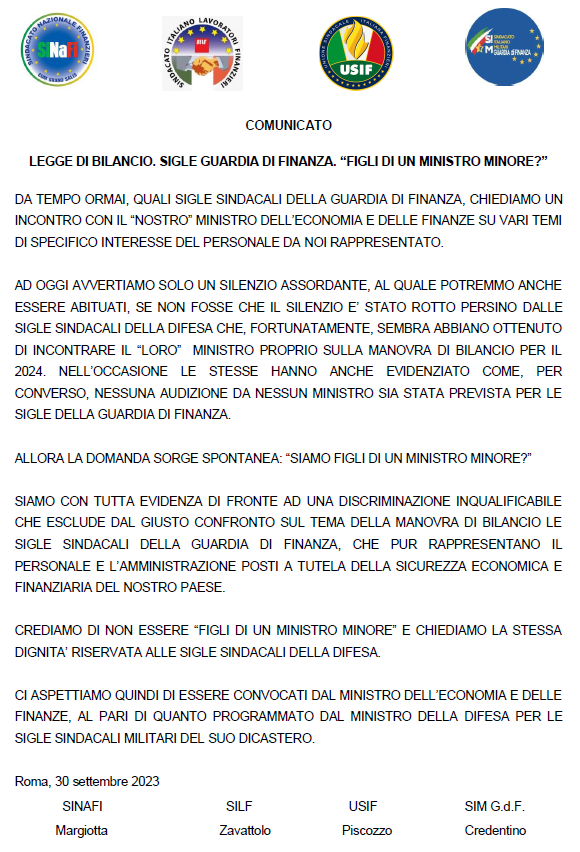 SIGLE SINDACALI DELLA GUARDIA DI FINANZA, CHE PUR RAPPRESENTANO IL