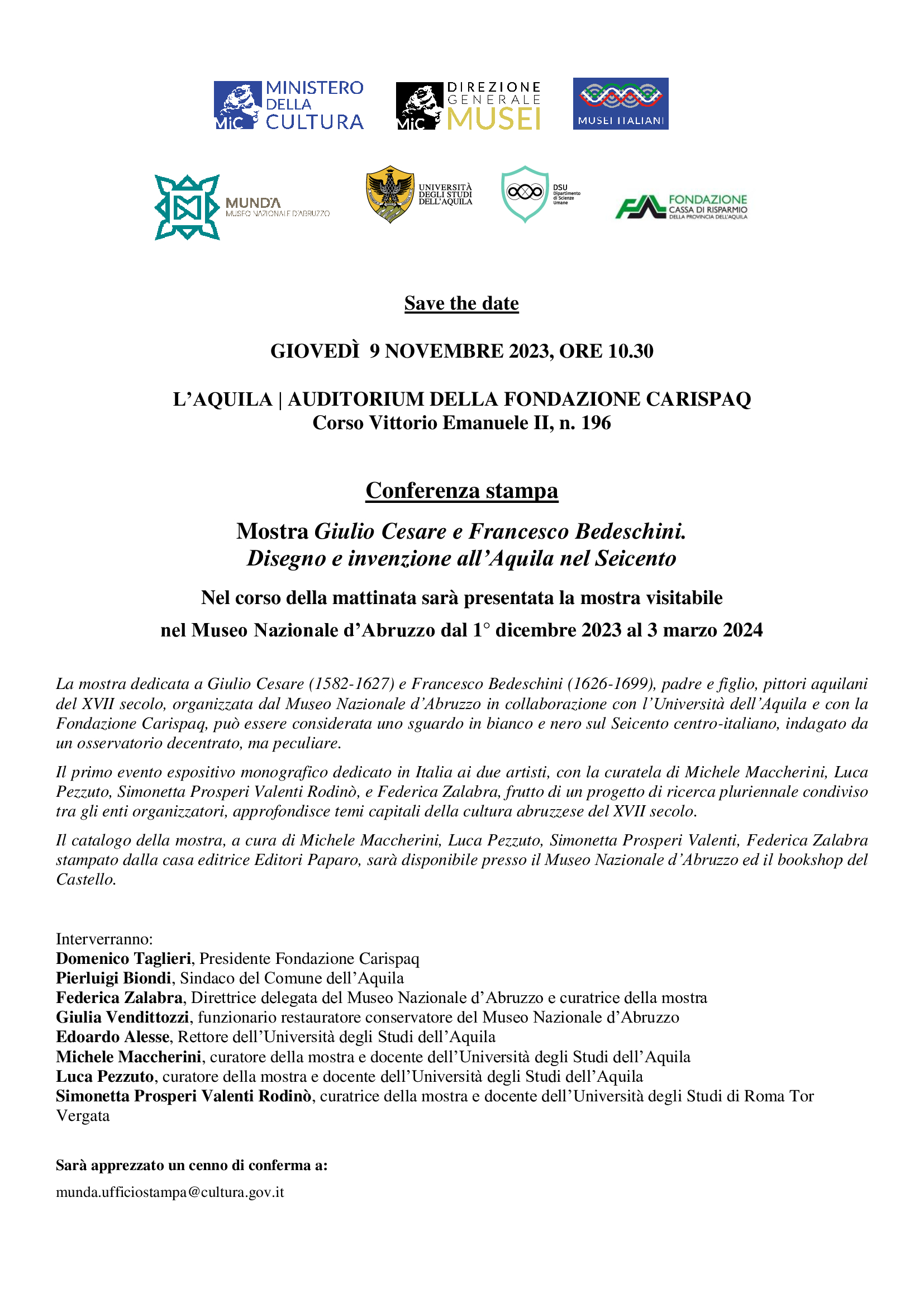 Save the date: 9 novembre, 10.30 ” Giulio Cesare e Francesco Bedeschini. Disegno e invenzione all’Aquila nel Seicento”. Presentazione mostra alla Fondazione Carispaq