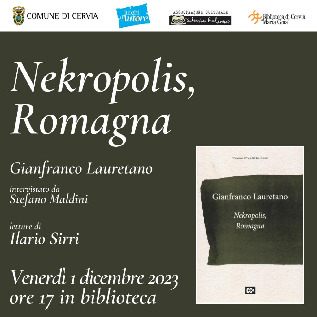 L’associazione culturale Tolmino Baldassari organizza in biblioteca la presentazione dell’ultimo libro di Gianfranco Lauretano, “Nekropolis, Romagna” (Risguardi, 2022). L’iniziativa fa parte del calendario “Luoghi d’autore” promosso dall’Amministrazione comunale di Cervia. Lauretano sarà intervistato dal poeta cesenate Stefano Maldini; letture di Ilario Sirri.