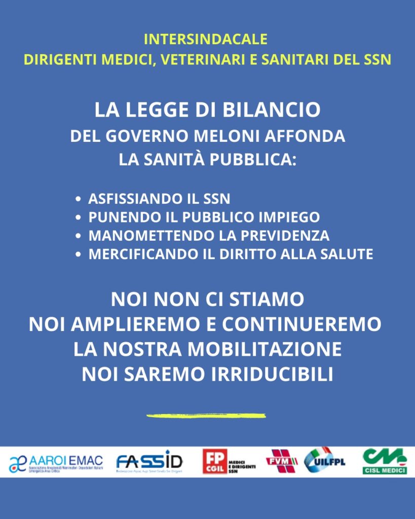 Per colpa delle scelte di questo governo che, come i precedenti, dice di voler difendere il SSN, ma poi agisce in senso contrario a favore della sanità privata e delle assicurazioni sanitarie per chi potrà pagarsele, le nostre proteste proseguiranno il loro corso come consentito dalle norme di legge vigenti per i servizi essenziali che rappresentiamo, nel solco comune della nostra mobilitazione, che riprenderà con ancor maggior vigore a gennaio, qualora la Manovra attesa per fine dicembre fosse approvata senza adeguati correttivi.