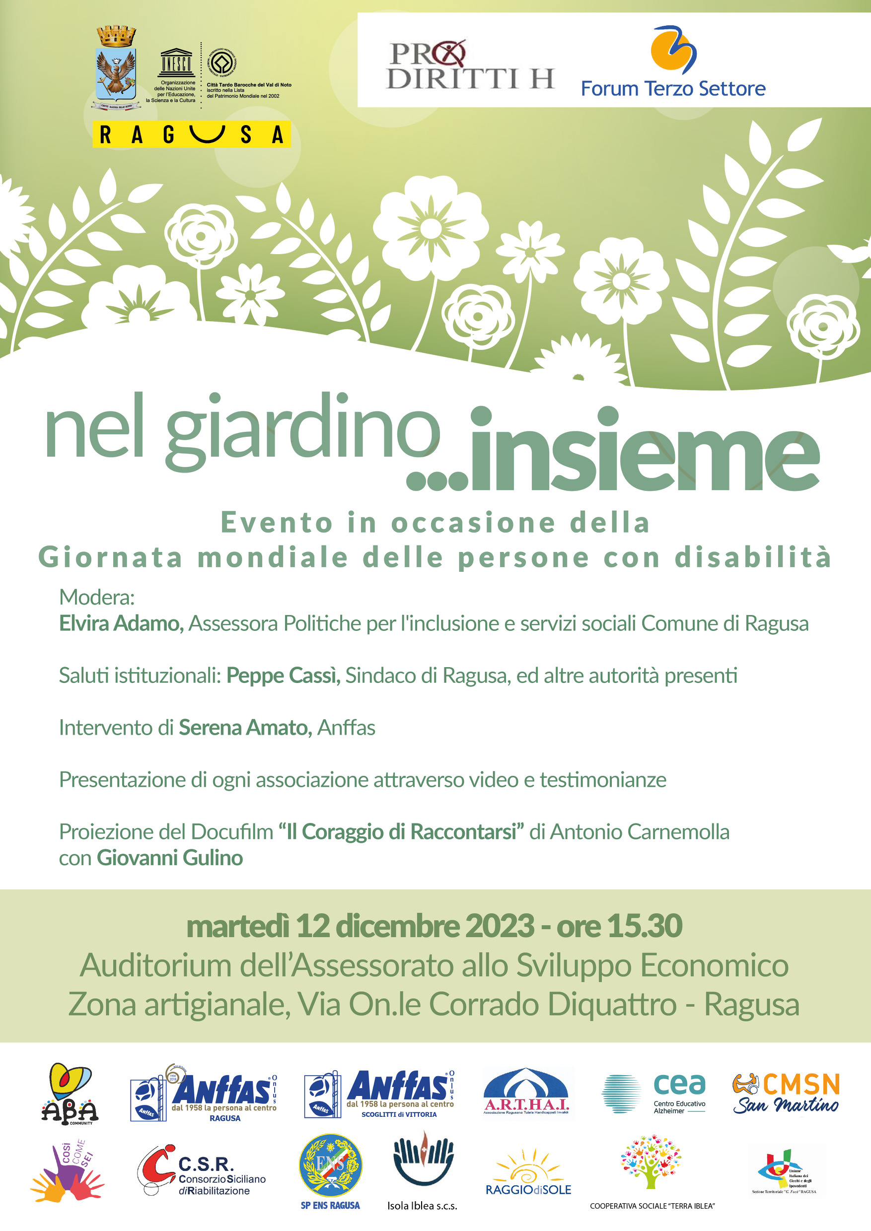 Il 12 dicembre 2023, alle 15.30, all’Auditorium dell’Assessorato allo Sviluppo Economico Zona Artigianale – Via On.le Dott. Corrado Di Quattro – si svolgerà il convegno “Nel giardino…insieme”, un evento per incontrare le associazioni delle persone con disabilità, le loro famiglie e per conoscere le loro storie, le loro vite e i loro bisogni.