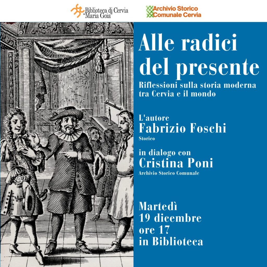 Martedì 19 dicembre alle ore 17 la Biblioteca di Cervia e l’Archivio storico comunale di Cervia organizzano “Alle radici del presente. Riflessioni sulla storia moderna tra Cervia e il mondo”. Fabrizio Foschi, storico e autore del volume “Una storia dell’epoca moderna. Spazi, trame, personaggi alle radici del nostro presente” (Rubettino, 2023), dialogherà con Cristina Poni, responsabile dell’Archivio storico comunale. Partendo dal recente libro di Foschi e dalla nostra realtà locale, il dialogo toccherà temi come il ruolo della storiografia e il rovesciamento del concetto di “Fine della storia”.