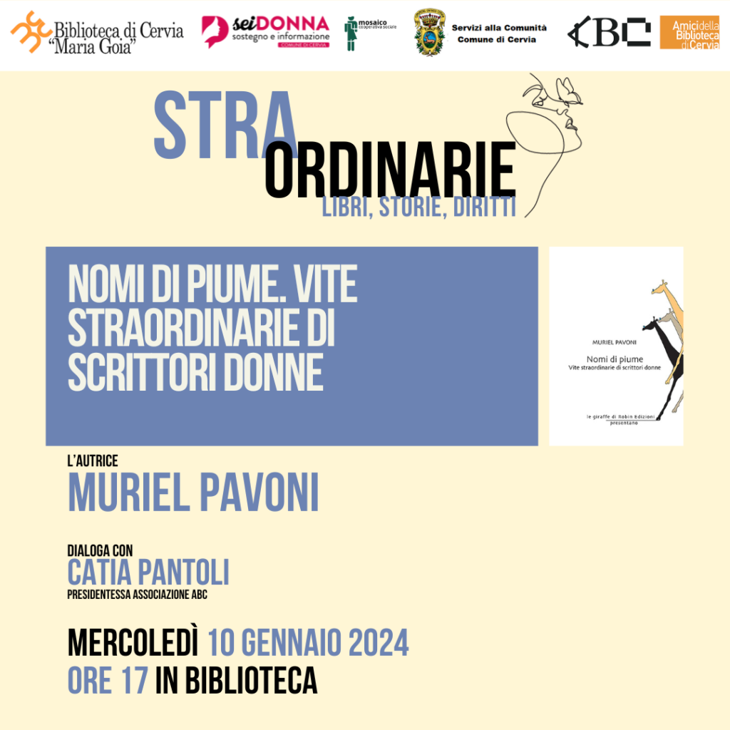 (AGENPARL) – ven 05 gennaio 2024 Rassegna “StraOrdinarie. Libri, storie, diritti”. Mercoledì 10 gennaio alle 17.00 incontro in Biblioteca su “Nomi di piume. Vite straordinarie di scrittori donne” con Muriel Pavoni