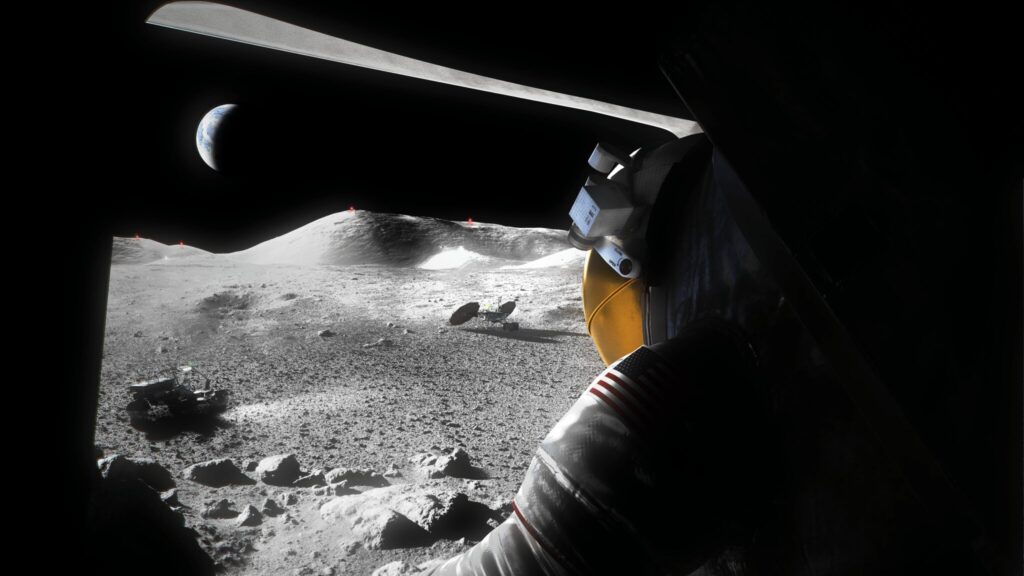 An illustration of a suited Artemis astronaut looking out of a Moon lander hatch across the lunar surface, the Lunar Terrain Vehicle and other surface elements.