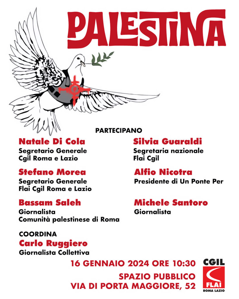 “PALESTINA”, questo il titolo dell’iniziativa promossa dalla Flai Cgil Roma e Lazio, che si terrà il giorno 16 gennaio, ore 10.30, a Roma, Via di Porta Maggiore 52.