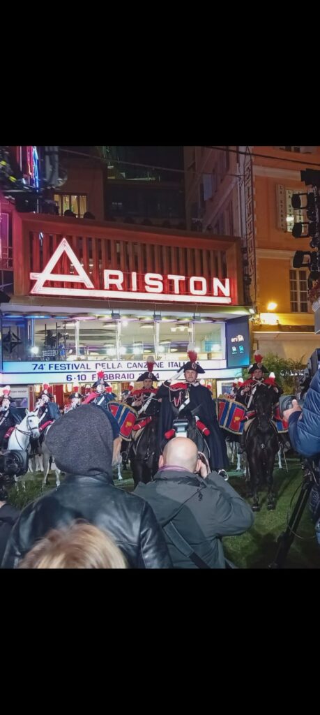 Quinto. L’orgoglio Italiano della Fanfara a Cavallo dell’Arma dei Carabinieri, che il mondo ci invidia, si apre con 25 binomi davanti all’ingresso del Teatro Ariston sanremese con il brano “La