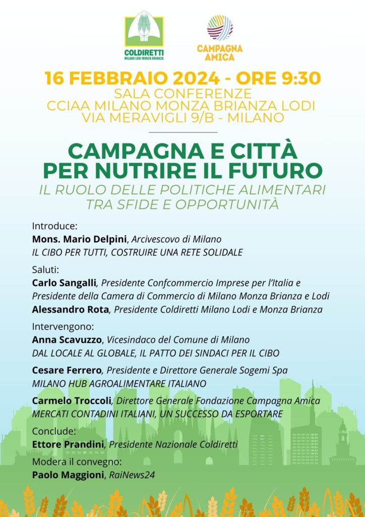 La produzione e la distribuzione del cibo, la responsabilità sociale delle istituzioni e delle imprese del settore agroalimentare, il rapporto tra mondo agricolo e metropoli: sono solo alcuni dei temi al centro del convegno organizzato per venerdì 16 febbraio 2024 nel capoluogo lombardo dalla Coldiretti di Milano, Lodi e Monza Brianza con Campagna Amica.