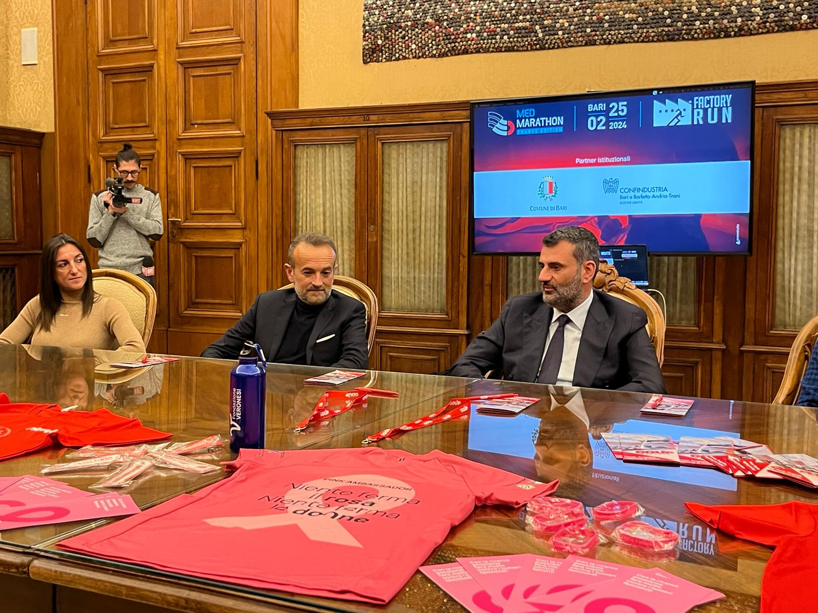 E’ stata presentata questa mattina, nella sala giunta di Palazzo di Città, la terza edizione della “Bari Med Marathon”, la 21 km del capoluogo pugliese rivolta ai 22 Paesi del Mediterraneo, quest’anno dedicata alla Francia. La manifestazione è organizzata da La Fabrica di Corsa in partnership con la sezione Sanità di Confindustria Bari-BAT e con il sostegno del Comune di Bari. La gara porterà, per la prima volta a Bari, atleti iscritti provenienti da 19 Paesi europei ed extraeuropei, contribuendo in maniera significativa all’attrattività della città. Alla presentazione sono intervenuti il sindaco di Bari Antonio Decaro, l’assessore allo Sport Pietro Petruzzelli, la presidente della Sezione Sanità di Confindustria Bari-Bat Annabella Cascione, il segretario generale del Corpo Consolare di Puglia-Basilicata-Molise e presidente della sezione Turismo di Confindustria Puglia Massimo Salomone, il console onorario di Francia Stefano Romanazzi, la presidente de La Fabrica di Corsa Antonella Favale, l’organizzatore dell’evento Pierdavide Losavio e Isabella Murgolo in rappresentanza delle Pink Ambassador della Fondazione Veronesi.